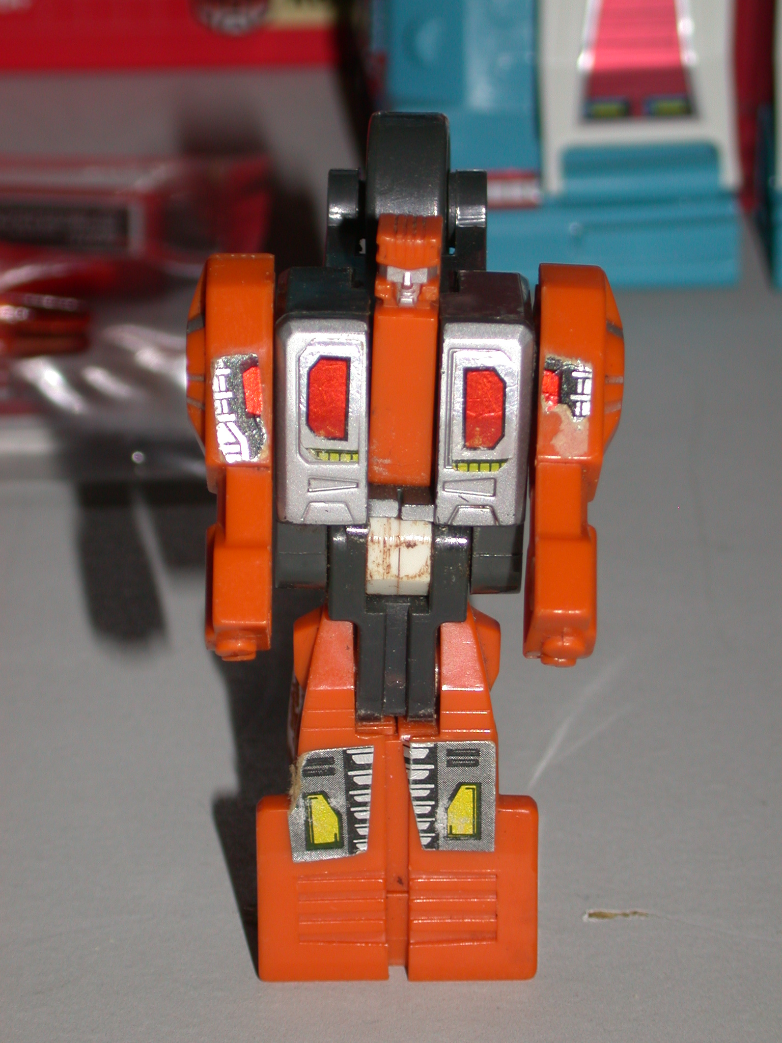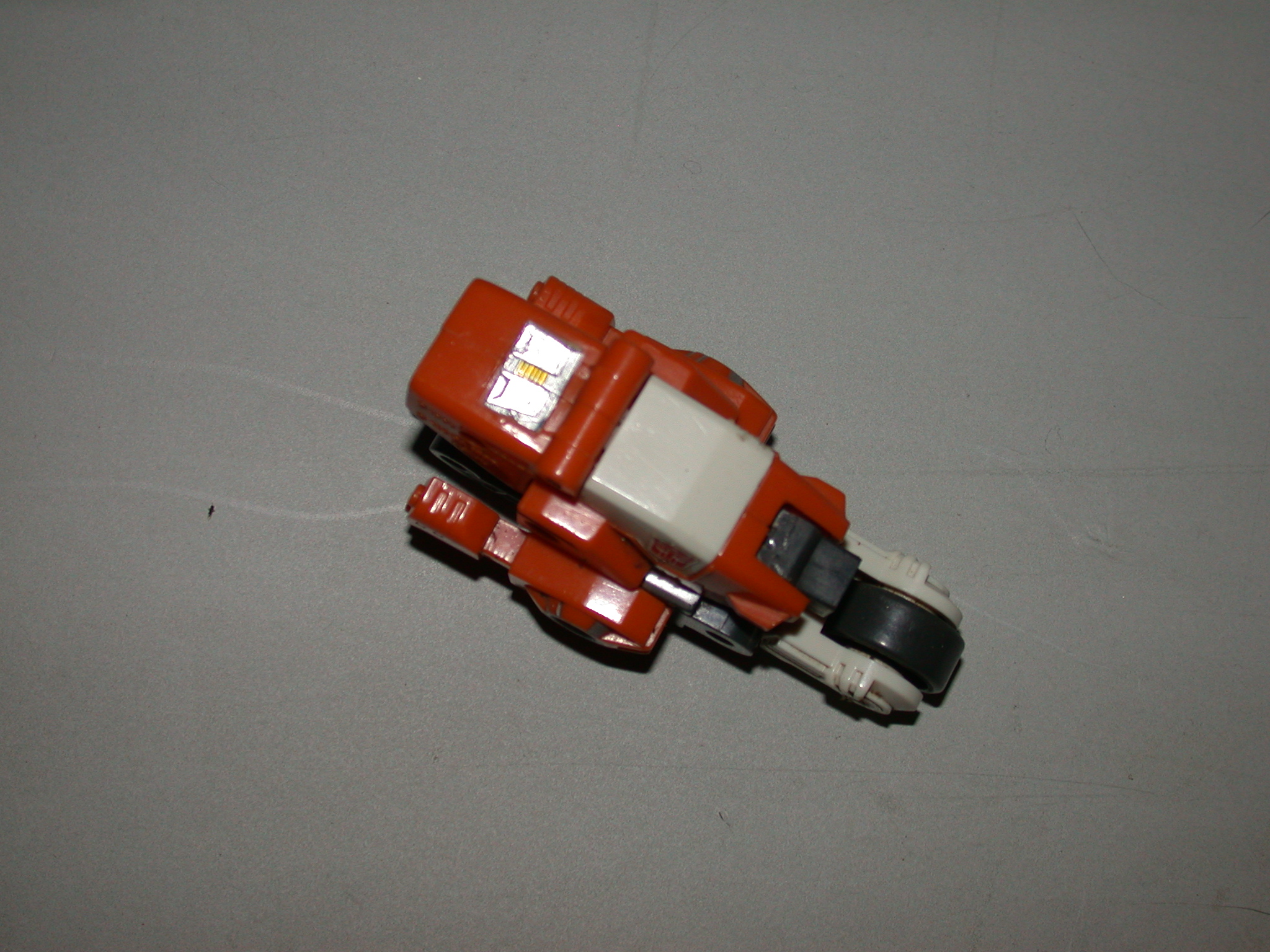 Quick to anger, even quicker to attack. Defiant, uncooperative, nasty tempered. Hates authority. In vehicle mode, uses solid rocket fuel packs to boost speed to 450 mph. Tires secrete adhesive that enables him to drive up most walls. Carries 2 laser-guided incendiary missiles, rapid-fire plasma pulse cannon. In robot mode, uses semi-automatic sonic blaster pistol. Combines with fellow Technobots to form Computron. | |||||||