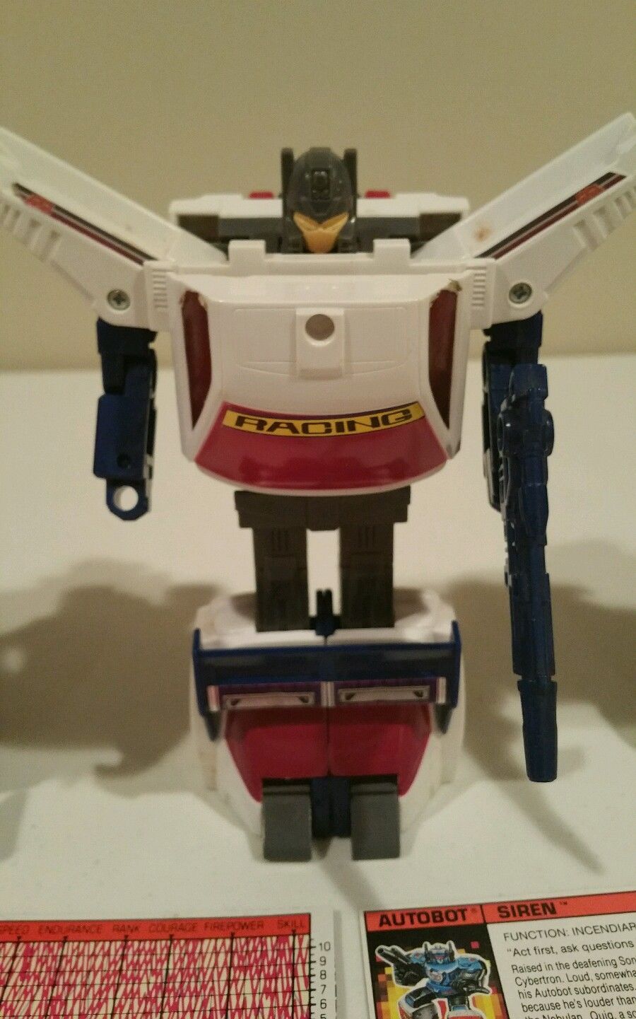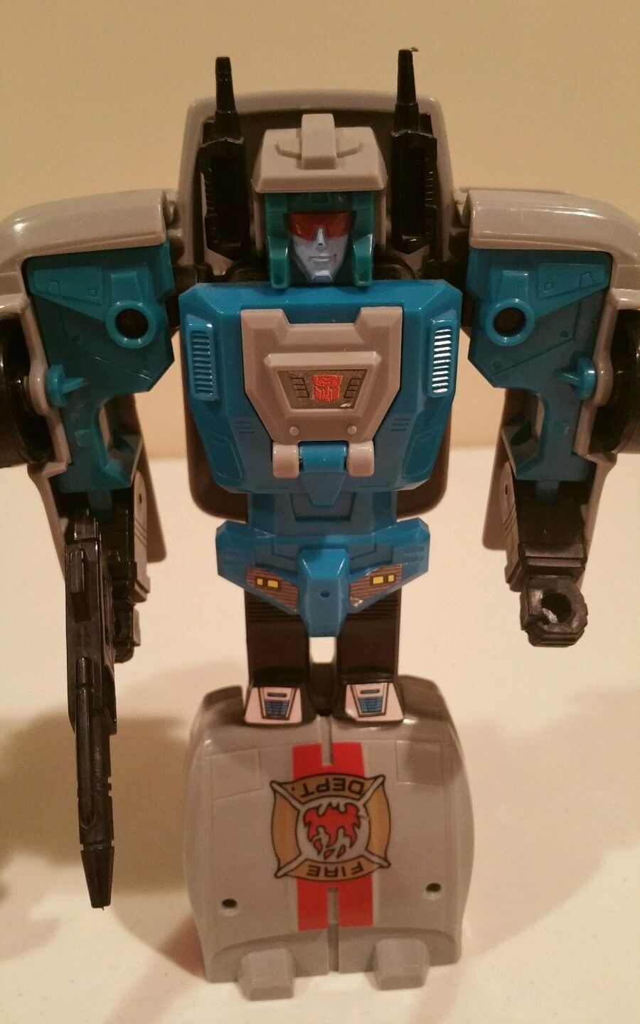 Abilities: Getaway is a master military strategist. In vehicle mode his 600 horsepower racing engine (Rev in engine mode) allows him to reach speeds of 540 miles per hour. He is equipped with bullet-proof windows and shell-resistant battle armor. His range is 1200 miles. An on-board computerized navigational system allows him to plot a long-range course in advance, so that he can give his attention to other matters as he travels. He is armed with a double-barrelled plasma-shell shotgun.