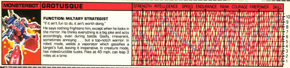 Profile: Everything's a joke to Grotusque, and - as he says - why shouldn't it be, when the only thing that frightens him is looking at himself in the mirror! Though he doesn't doubt Primus saw him as part of some great and noble scheme, he does wonder what his creator was thinking of when he designed his creature mode. A bit too much high grade energon the night before, is Grotusque's opinion! This goofy, irreverent outlook on life is as appealing as it is annoying to his fellow Autobots. Sometimes, just sometimes, they wish Grotusque would take something seriously. Even in pitched battle, in dire, possibly terminal situations, he's joking away. But it's not bluster to hide his fear - Grotusque is not only a topnotch warrior, his courage is legendary. No, it's that Grotusque sees life in general as a joke, and therefore sees no reason to view death any differently. "Why shouldn't combat be fun?" he's been heard to utter. "If it wasn't, I'd be loath to do it!" Though he appears on the surface to be offhand about his duties, Grotusque is a brilliant campaign planner, with a sharp and analytical mind perfectly suited to the complexities of warfare.