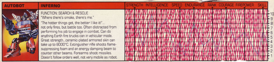 Profile: "The hotter things get, the better I like it!" When Inferno says this, he's not merely referring to fires. His love for combat increases with its intensity as well, a fact appreciated by both friend and foe alike. Although his primary role is search and rescue, performing it usually takes him into the heat of battle where he is often distracted into participating. If Optimus Prime has any complaint about Inferno, it's that he doesn't stick to his assigned task. But that's because he wants to do too much, not too little, and Optimus can't really complain about that.