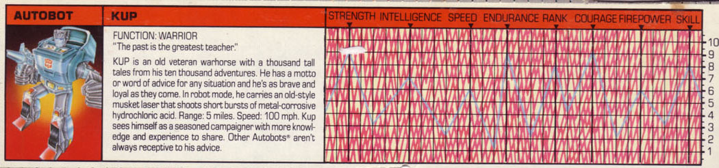 Kup is an old veteran warhorse with a thousand tall tales from his ten thousand adventures. He has a motto or word of advice for any situation and he's as brave and loyal as they come. In robot mode, he carries an old-style musket laser that shoots short bursts of metal corrosive hydrochloric acid. Range: 5 miles. Speed: 100mph. Kup sees himself as a seasoned campaigner with more knowledge and experience to share. Other Autobots aren't always receptive to his advice. | |||||||