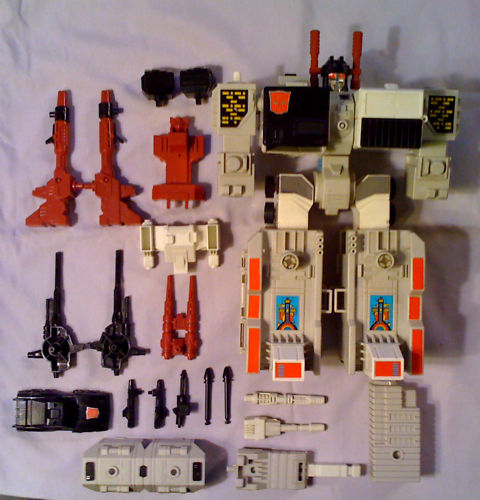 Startlingly versatile, staggeringly strong, the Autobot's last line of defense... a mighty instrument of titanic destructive force. Extremely modest about his achievements... berates himself for not doing more. In robot mode, he can lift 70,000 tons, has shoulder-mounted twin high-energy maser cannons and omni-directional receiving and transmitting antenna. In city mode, has helipad and fully equipped repair bays that can handle four vehicles at once. Left rear tower transforms into tank, Slammer, who has rocket-propelled mortar cannon. Scamper is sports car with side mounted electro-blasters; transforms into robot, uses high-energy particle beam pistol. Six-gun is small robot, has ion-pulse rifles for arms, twin surface-to-air guided missile launchers on back, acetylene pistol. In battle station mode, uses all these weapons and twin disrupter rays, laser lances, powerful anti-matter projectors. | |||||||
