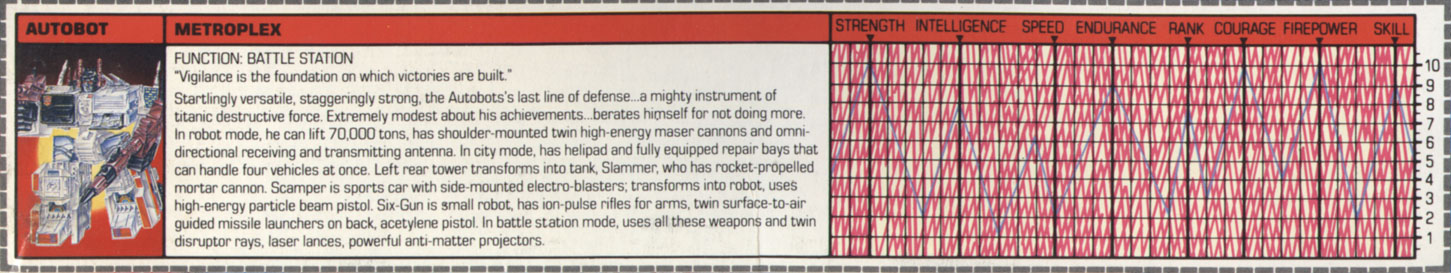 Profile: Possessed of startling versatility and staggering strength, Metroplex is the robot they depend on when all other options are exhausted. In battle, he is a mighty instrument of titanic destructive force, unwavering and ever-valiant in his attack. The very ground trembles when he unleashes the explosive energies of his weaponry. But despite his enormous power, Metroplex suffers from extreme modesty. In fact, he often berates himself for not being able to contribute more to the Autobot cause, a comment that never fails to mystify his comrades and even causes some to shake their heads and laugh at its absurdity. Metroplex's role usually prevents him from being in the front lines, a situation he finds frustrating, but one the other Autobots understand and accept completely. Their friendship and respect for him is clear evidence of that. And they all prefer Metroplex in his current role. Knowing he's backing them up is a constant source of reassurance. As one Autobot once said, "No matter what happens to the rest of us, the war's not over as long as Metroplex is there."