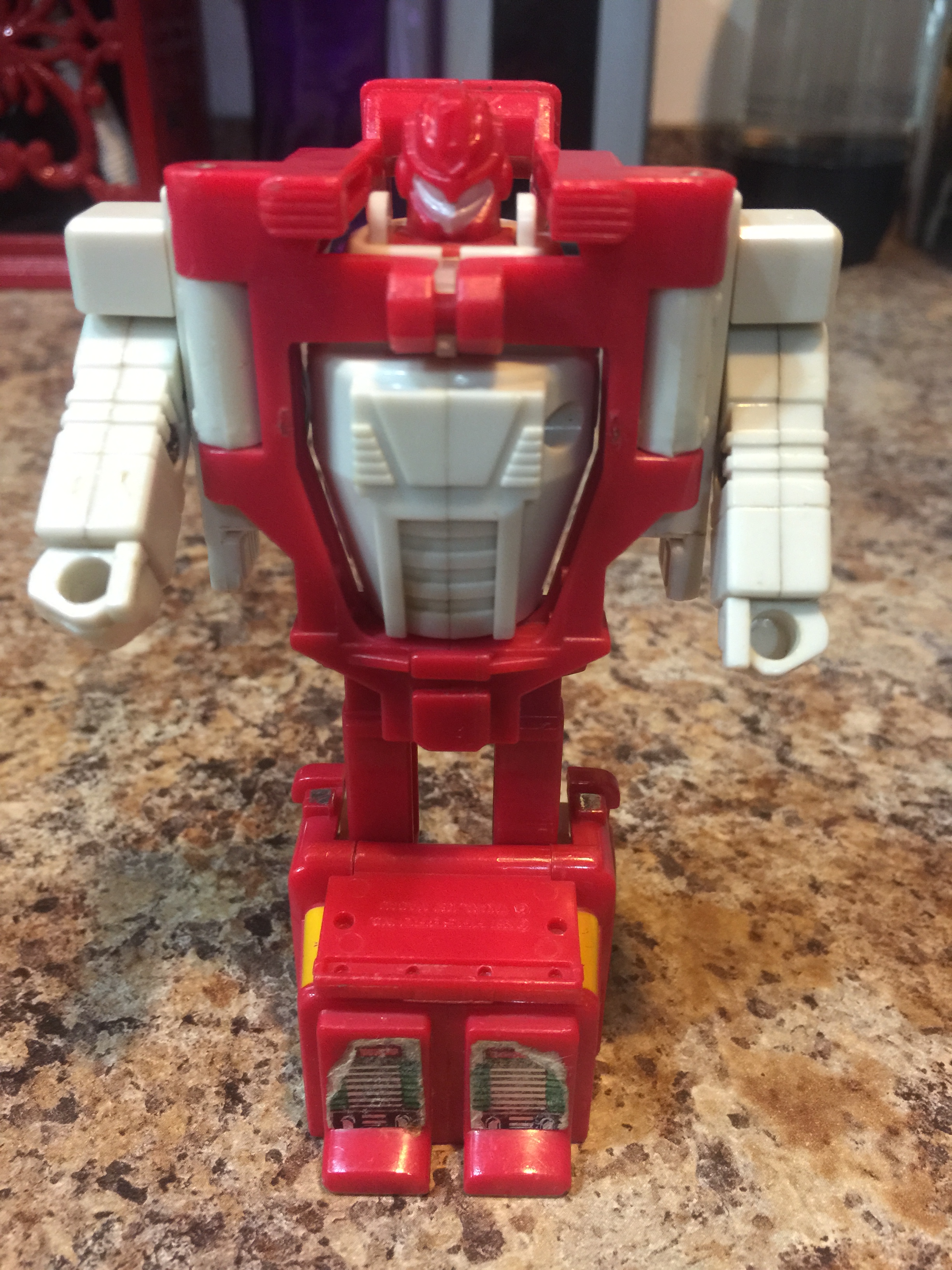 He is in okay condition as seen in the photos, but is far from perfect. Nothing broken, but lots of play and sticker wear. I may just keep him as a filler and replace him later with with a complete one that has his two Targetmasters. **