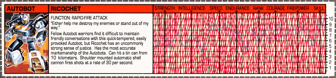 Profile: Fellow Autobot warriors find it difficult to maintain friendly conversations with this quick-tempered, easily provoked Autobot, but Ricochet has an uncommonly strong sense of justice. Has the most accurate marksmanship of the Autobots. Can hit a tin can from 10 kilometers. Shoulder mounted automatic shell cannon fires shots at a rate of 30 per second.