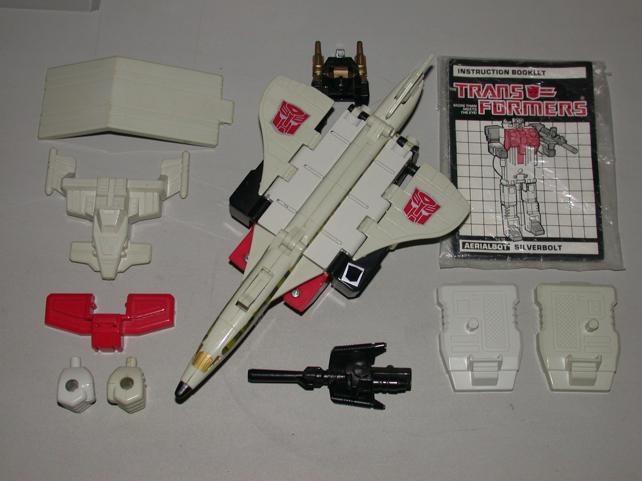 **Silverbolt is one of the guys I got in a trade as a kid. For more of the story, check out Superion and Optimus Prime. Silverbolt is in good condition with fairly tight joints and minor sticker wear. I really liked this guy as a kid, because not only was the biggest of the Aerialbots, and their leader, but loved hooking the ramp up to him and making him a base. See the bottom pictures for his base mode. He comes almost complete with his instructions, his gun, which is the Electrostatic Discharger Rifle, Superions Blast shield, the Blast Deflector, the Superion Head, both Superion Fist, both Superion Feet, and the ramp. I am just missing his Tech Specs. Needs a little cleaning.**