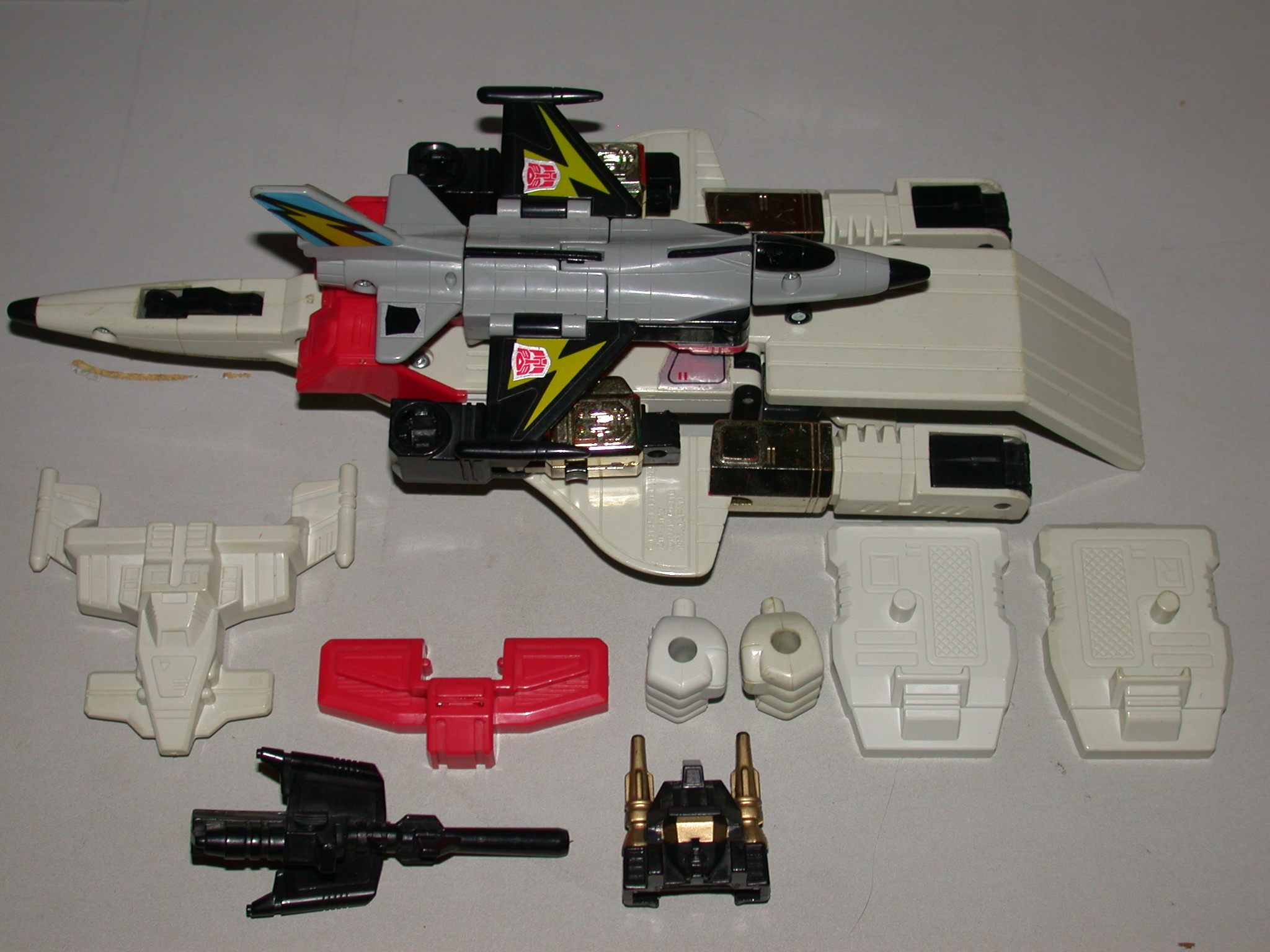 Abilities: In jet mode, Silverbolt can reach Mach 1.9 and has a range of 4500 miles. He carries on his underside an electrostatic battery, which allows him to strip electrons from air molecules as he's flying and store them. He can then direct this stored charge through his nose cone as a powerful bolt of electricity. He's capable of storing and releasing up to 150,000 volts at a time. He's especially effective in lightning storms, due to their abundance of charged particles. He carries an electrostatic discharger rifle in robot mode that has the same capability. He combines with the other Aerialbots to form the giant robot known as Superion.