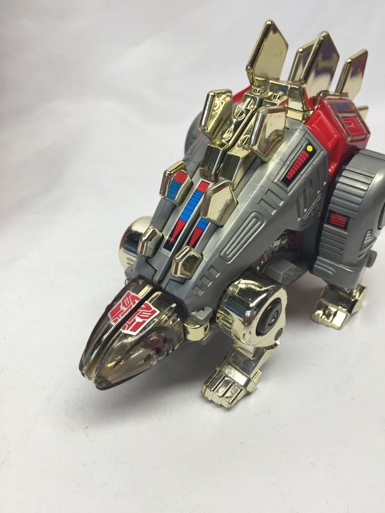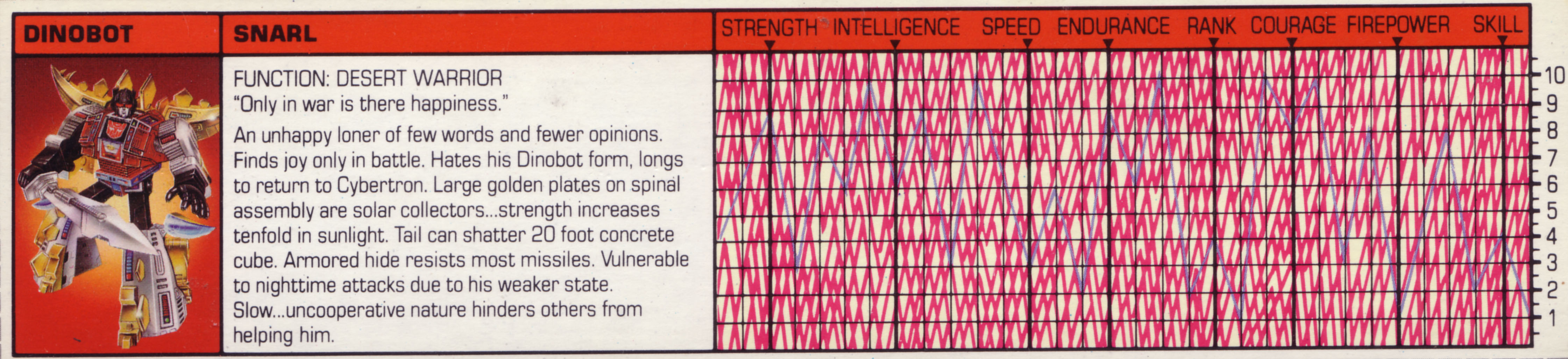 An unhappy loner of few words and fewer opinions. Finds joy only in battle. Hates his Dinobot form, longs to return to Cybertron. Large golden plates on spinal assembly are solar collectors... strength increases tenfold in sunlight. Tail can shatter 20 foot concrete cube. Armored hide resists most missiles. Vulnerable to nighttime attacks due to his weaker state. Slow... uncooperative nature hinders others from helping him. | |||||||