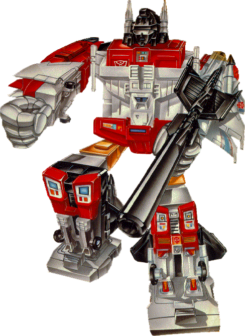 A fierce and frightful fighting machine. Suppresses thought of the five Aerialbots that comprise him, directs his thinking to one purpose: destruction of Decepticons. Cold, aloof. Flies at 800 mph, range 5800 miles. Can demolish a battleship with one blow. Uses electrostatic discharger rifle. Difficult for him to adapt to new situations or be innovative due to limited mental functions. | |||||||
