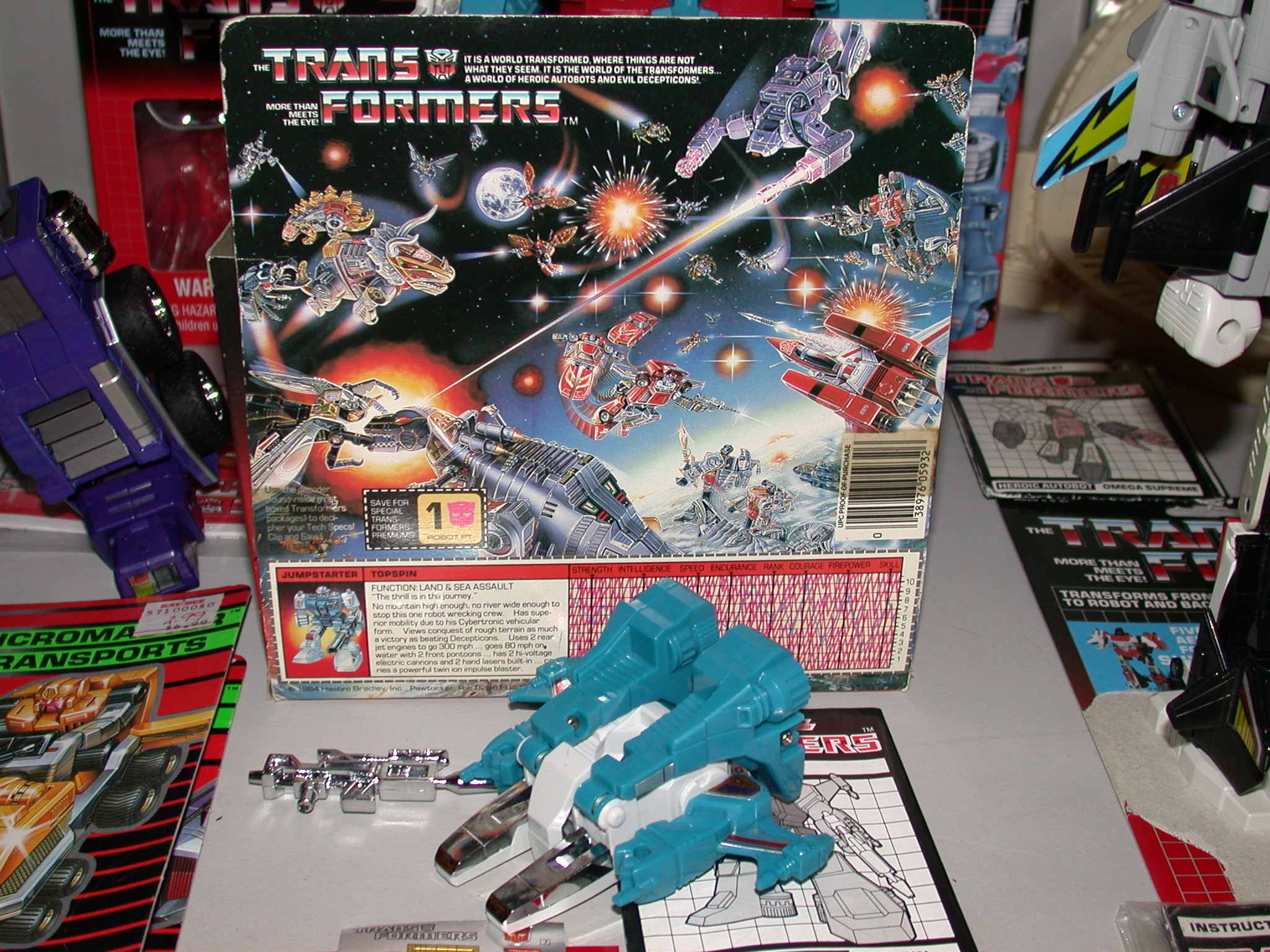 Abilities: In vehicle mode, Topspin is propelled by two rear-mounted jet engines, which can accelerate him to speeds of 300 mph on a flat surface. He also is equipped with two pontoons projecting from his front, which allow him to travel up to 80 mph on water, like a hydrofoil. Using two side-mounted high-voltage electric blasters, two small hand-mounted lasers, and a powerful particle beam rifle, Topspin can release a near-unrelenting barrage of devastating force. Like his brother, Twin Twist, he can spring from his vehicle mode into his robot mode in less than half a second. His weaponry is available to him in either mode.