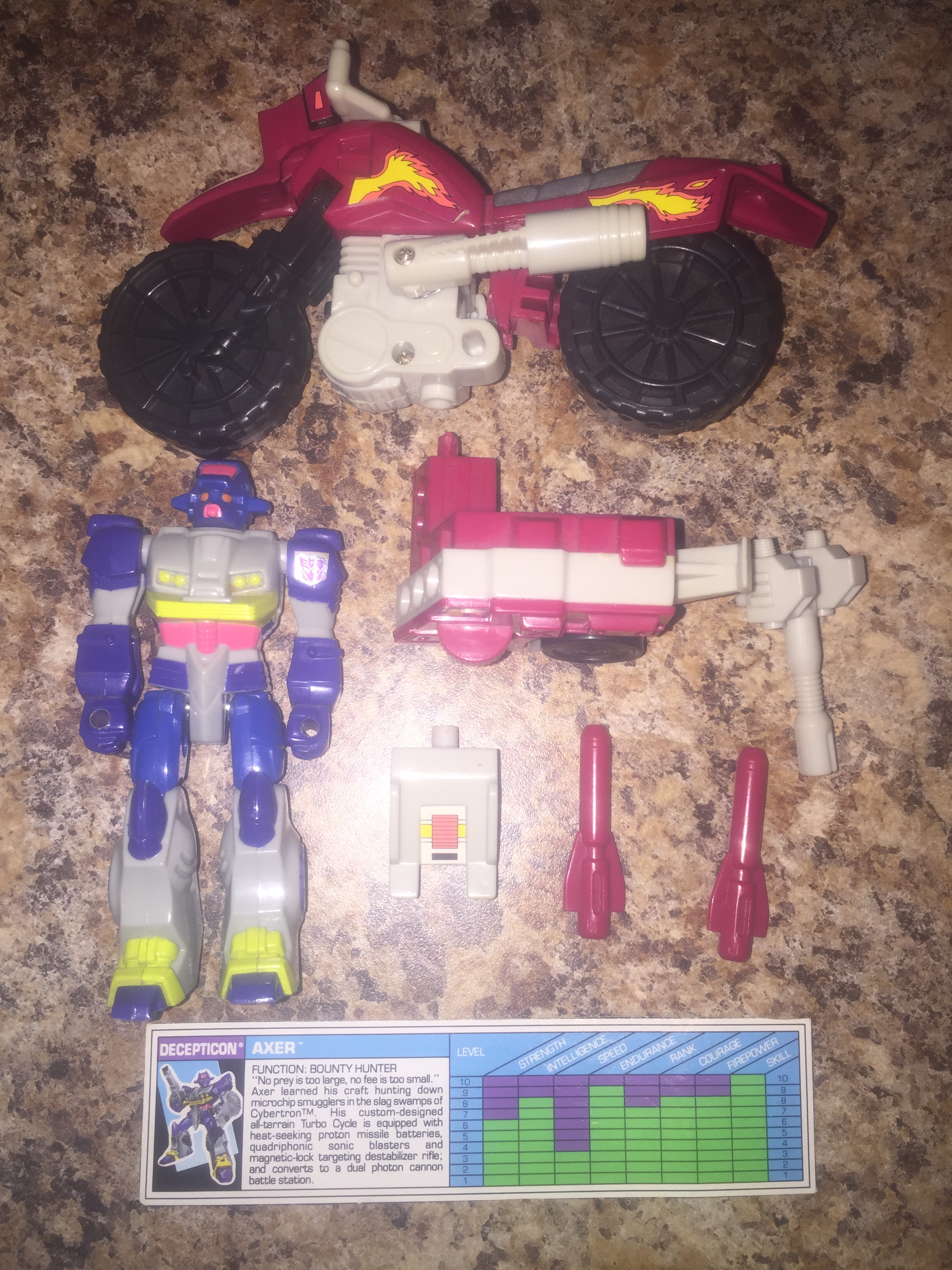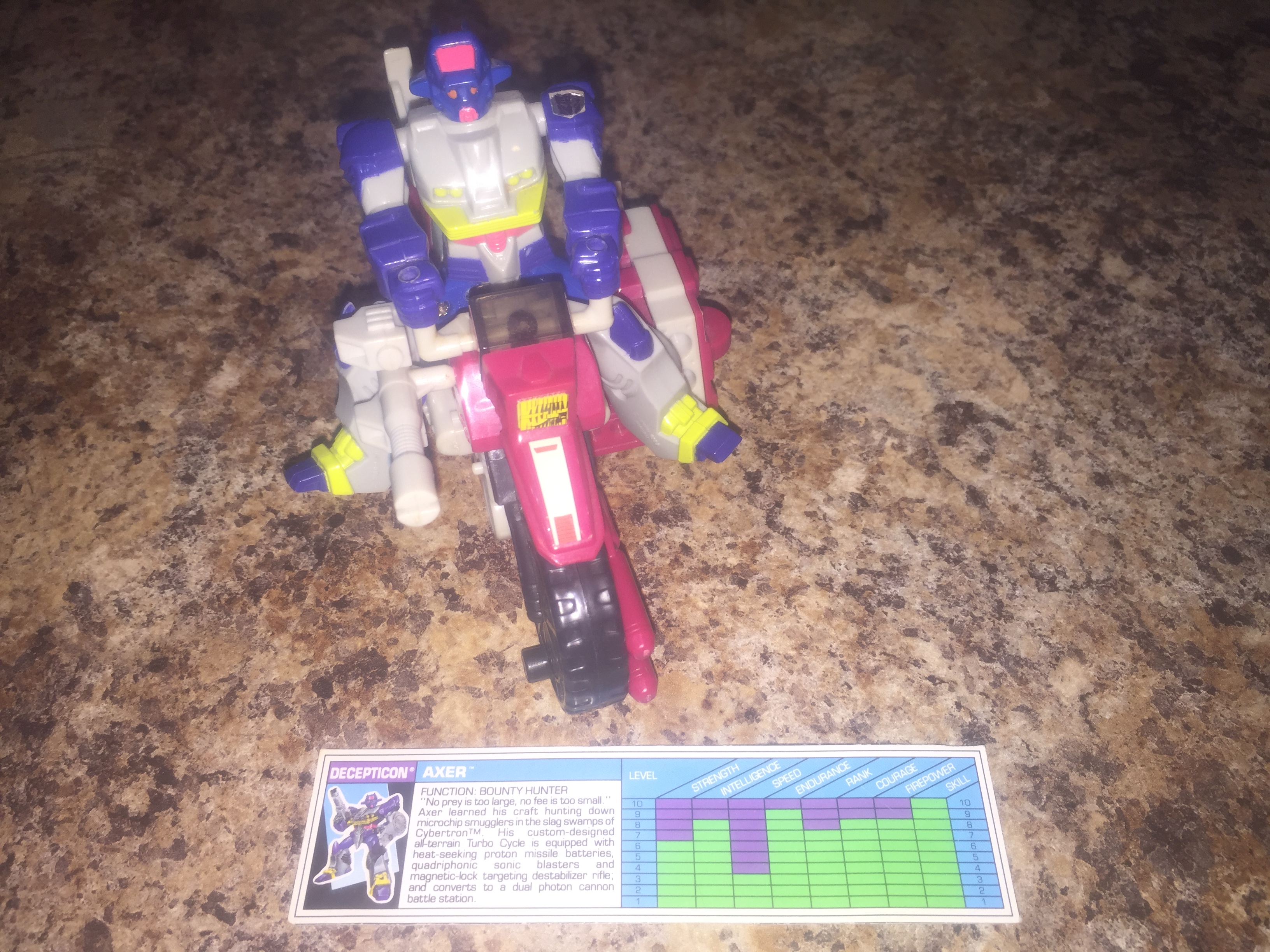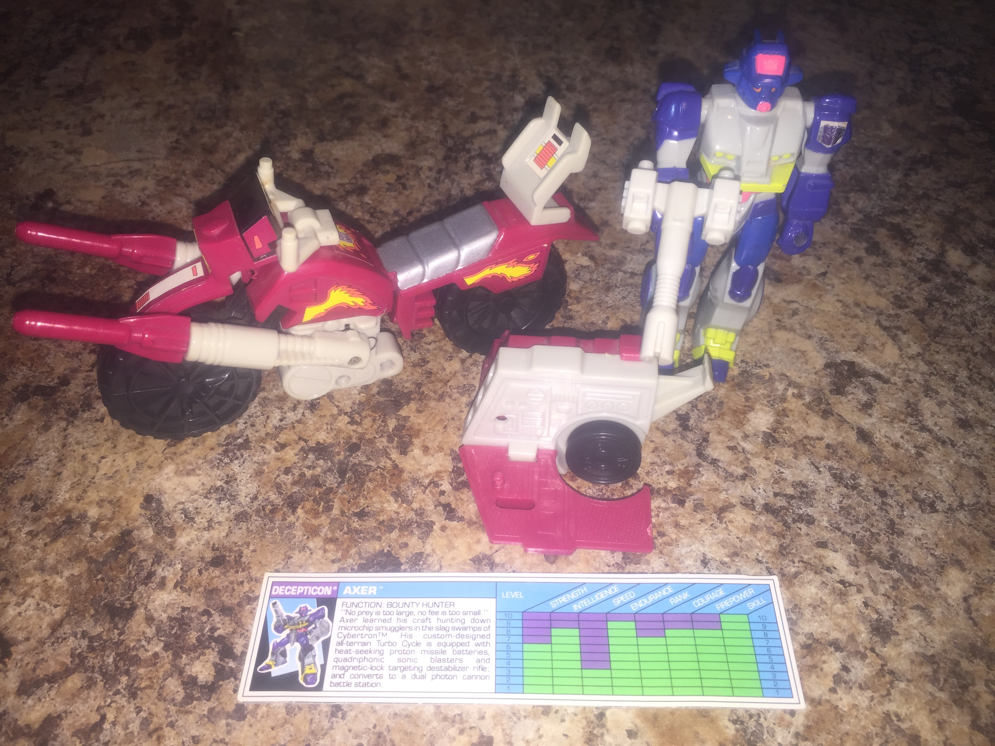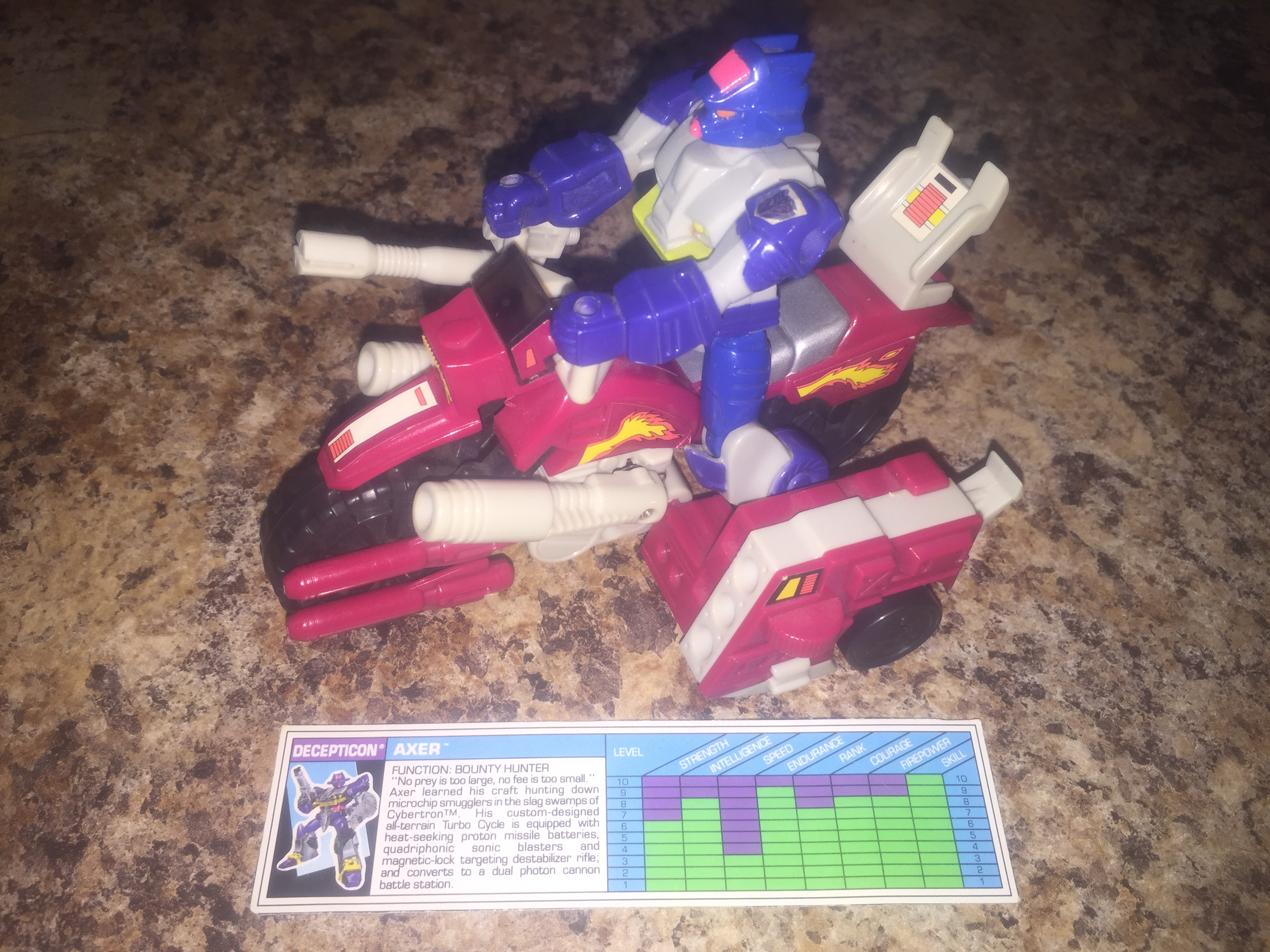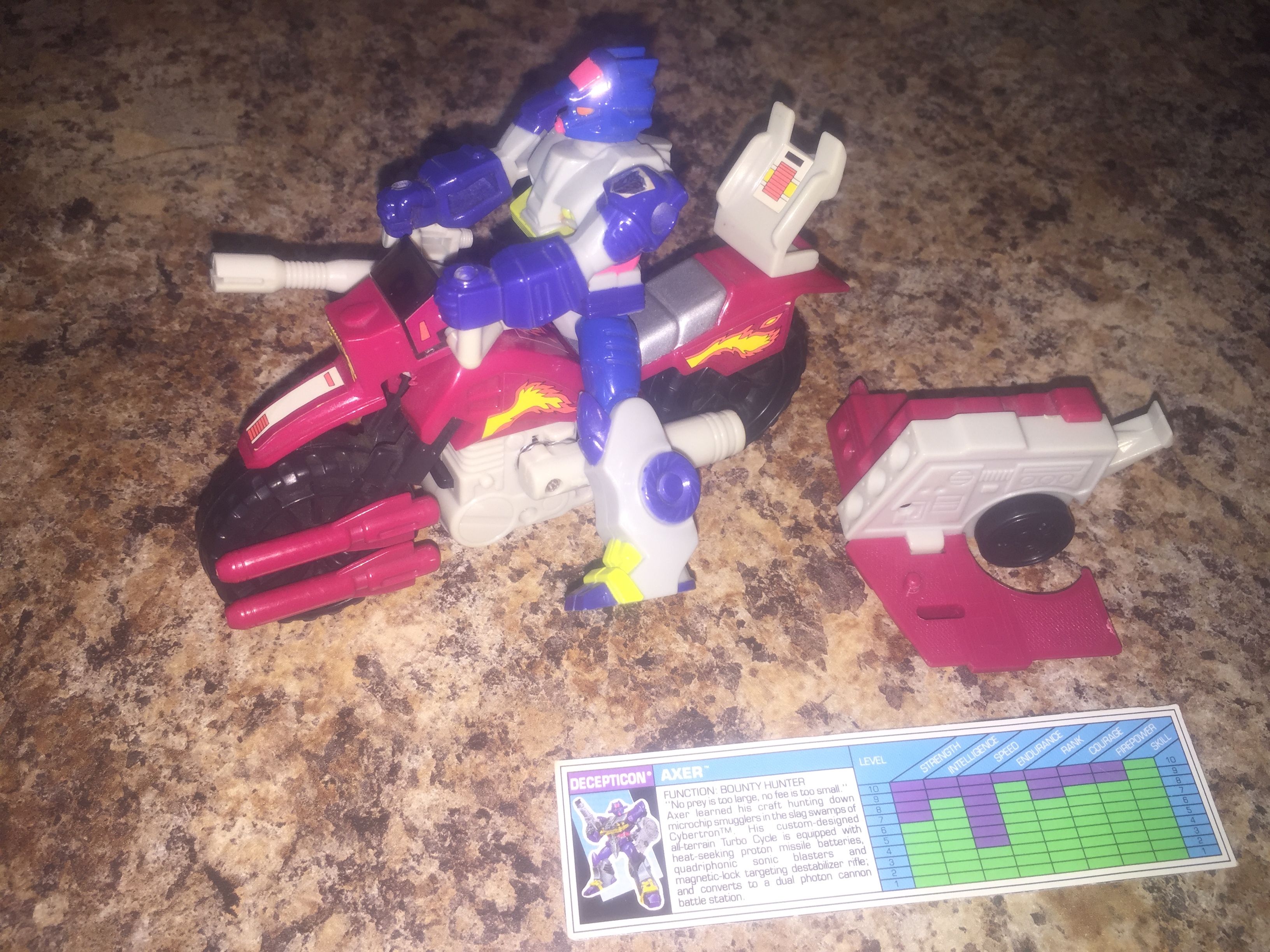Profile: Axer learned his craft hunting down microchip smugglers in the slag swamps of Cybertron. His custom-designed all-terrain Turbo Cycle is equipped with heat-seeking proton missile batteries, quadrophonic sonic blasters and magnetic-lock targeting destabilizer rifle; and converts to a dual photon cannon battle station.