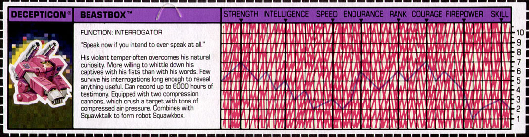 Profile: His violent temper often overcomes his natural curiosity. More willing to whittle down his captives with his fists than with his words. Few survive his interrogations long enough to reveal anything useful. Can record up to 6000 hours of testimony. Equipped with two compression cannons, which crush a target with tons of compressed air pressure. Combines with Squawktalk to form robot Squawkbox.