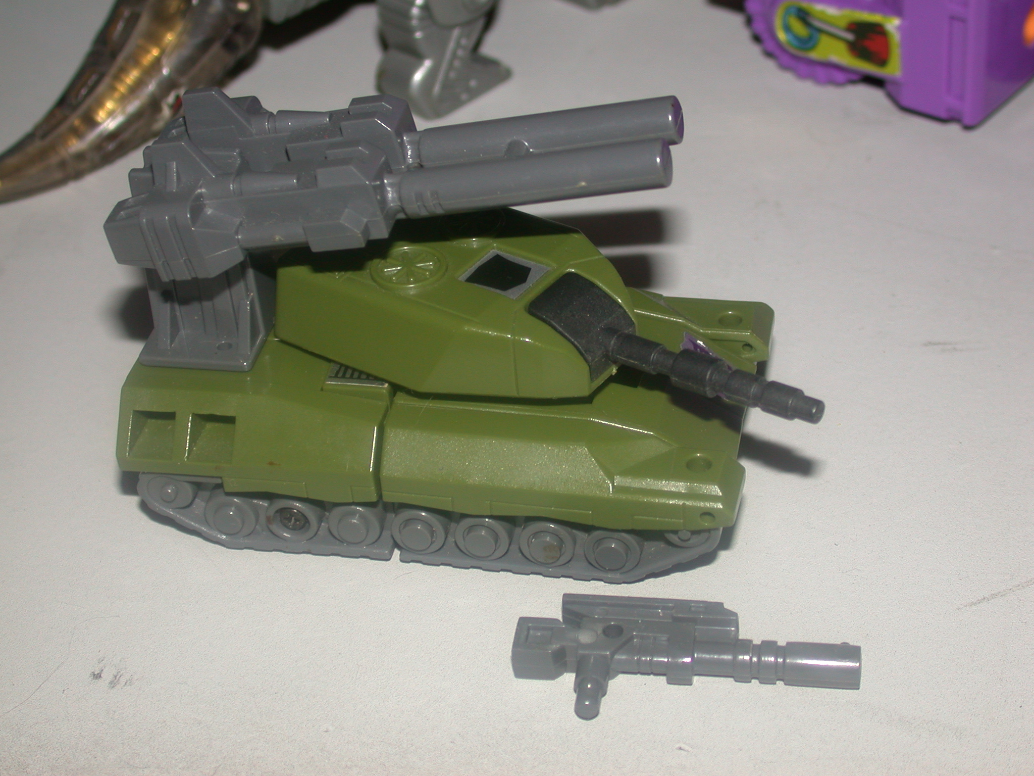 Noisy, irritates all nearby. Hair-trigger temper. blusteringly beligerent... a terrifyingly effective warrior. Enormously strong, resistant to most conventional artillery. As tank, goes 45 mph, range 600 miles. Turret-mounted gun shoots 200 lbs. TNT-equivalent shells, twin sonic cannon shoots powerful, ear-splitting 300-decibel burst of concentrated sound energy in stereo. In robot mode, has 10-Megawatt electron gun. Combines with fellow Combaticons to form "Bruticus." | |||||||