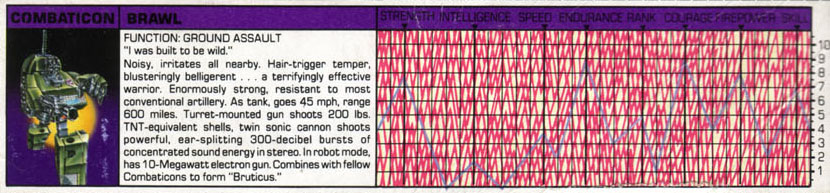 Abilities: Brawl possesses enormous strength and is resistant to most conventional artillery. In tank mode, he can reach speeds of 45 mph and has a range of 600 miles. His turret-mounted gun shoots a shell up to a distance of 3.5 miles with an explosive force of 200 Ibs. of TNT. His twin sonic cannon shoots powerful, ear-splitting bursts of concentrated sound energy of up to 300 decibels. He can manipulate this energy in stereo (a result of the cannon's dual configuration) to shatter anything from a crystal wine glass to a cinder-block bunker. In robot mode, he wields a 10-megawatt electron gun. He combines with his fellow Combaticons to form the giant robot, Bruticus.