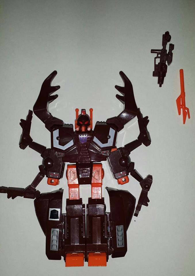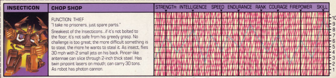 lasers on mouth; can carry 30 tons. As robot has photon cannon. Sneakiest of the Insecticons... if it's not bolted to the floor,