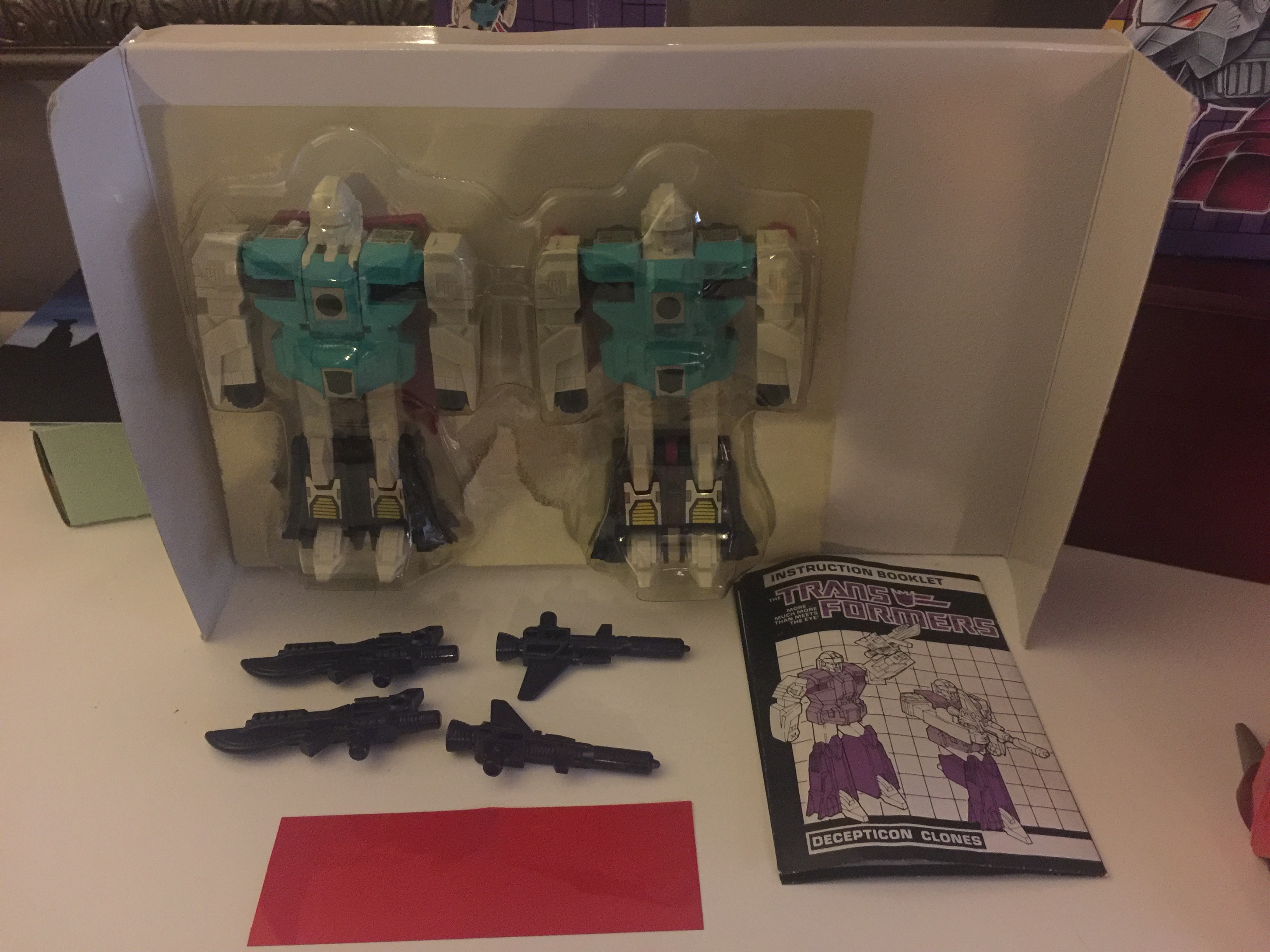 Pounce is in pretty good shape. He and his clone brother were my biggest victories in my eyes on this deal. They are complete with their box, their weapons, internal backer card and bubble, instructions and tech-spec decoder. Joints are pretty tight, and minimal sticker wear. As mentioned, I have him complete with his weapons, the two Anti-Personnel Missile Launching Bayonets. As seen in the photos, when I took advantage of that sale, I also got a boxed Pounce and Wingspan, some Targetmasters, as well as some other miscellaneous things. Check back for better pictures of just him.**