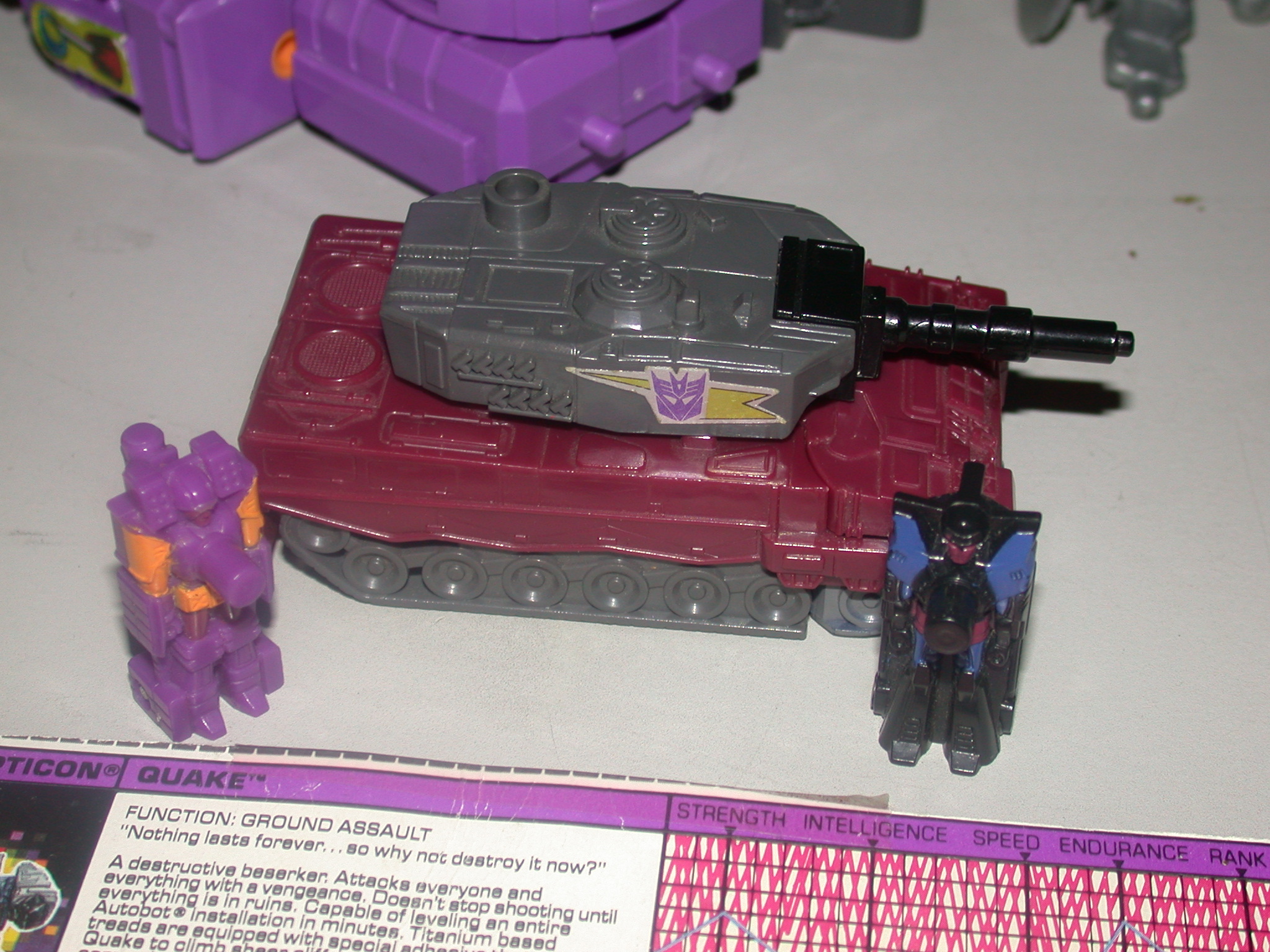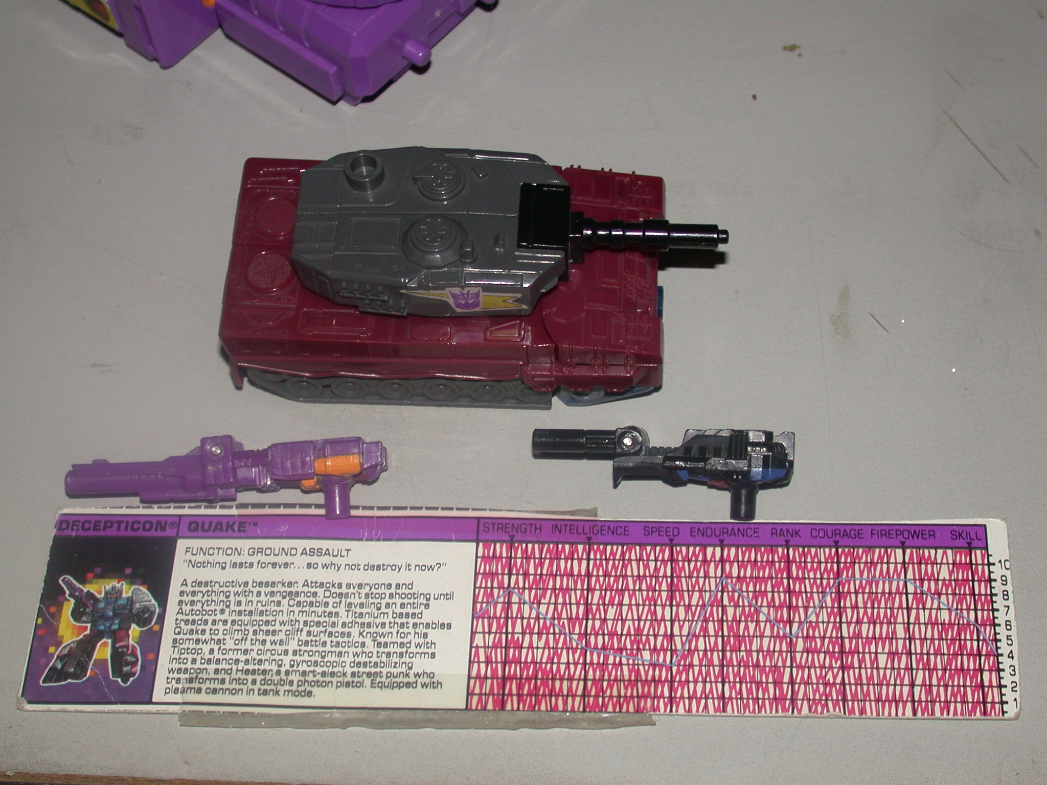 A destructive berzerker. Attacks everyone and everything with a vengeance. Doesn't stop shooting until everything is in ruins. Capable of leveling an entire Autobot installation in minutes. Titanium based treads are equipped with special adhesive that enables Quake to climb sheer cliff surfaces. Known for his somewhat "off the wall" battle tactics. Teamed with Tiptop, a former circus strongman who transforms into a balance-altering, gyroscopic destabilizing weapon, and Heater, a smart-aleck street punk who transforms into a double photon pistol. Equipped with plasma cannon in tank mode. | |||||||