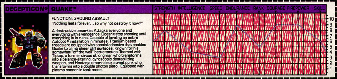 Profile: Reason has never been known to slow the raging onslaughts of this destructive berserker. Quake attacks everyone and everything with a vengeance. Only persistent cries from his fellow Decepticons of "point your guns the other way" and "the Autobots are over there, you idiot" prevent him from blasting those on his own side. Otherwise, he doesn't stop shooting until everything around him lies in ruins or he runs out of ammo, whichever comes first. Quake gives Megatron sufficient reason to question one of his most cherished theories of military strategy: "I'd rather have a fool who shoots than ten trained warriors who hold their fire." As Megatron has learned, when that fool is Quake, the gun can be pointing at you.
