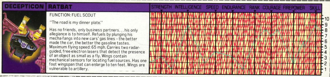 Profile: Ratbat has no friends, only business partners. His sole allegiance is to himself. The other Decepticons are aware of this, but cooperate with and tolerate Ratbat because of his vital and unique talent for locating fuel resources. So much do they value his services that they are willing to overlook his behavioral extremes. Ratbat prefers to refuel himself by plunging his mecha-fangs into the grime-free gas lines of brand-new cars; the better made the car, the better its gas tastes to him. This usually destroys the cars. Although many of the other Decepticons find this practice wasteful and disgusting, they are more than willing to help Ratbat indulge in his horrible habit by procuring cars for him. Besides, they know if Ratbat can't satisfy his fuel lust in that way, he might select one of them. And, given his importance, they are likely to let him.