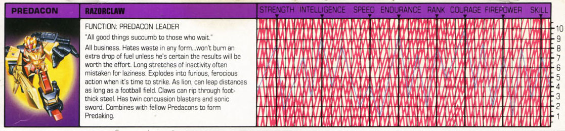 Profile: Razorclaw is all business - cruel, brutal business. He despises waste in any form. He does not spend a second of his time or burn a drop of his fuel unless he's certain of tangible results. In his case, that typically takes the form of the smoking wreckage of an enemy Autobot. Those who are not familiar with him often mistake his long stretches of inactivity for laziness and disinterest. That can be a fatal mistake. For, upon closer inspection, one would see that his eyes never close, that they are constantly shifting their gleaming steely stare, monitoring all they see. And when Razorclaw observes that the moment is just right, he explodes into furious, ferocious action. These belligerent bursts of energy usually only last a few seconds, but that's usually all it takes for Razorclaw to demolish an opponent. Afterwards, he returns to his resting state - keeping his own counsel, watching all around him... and waiting for the next right moment to strike!
