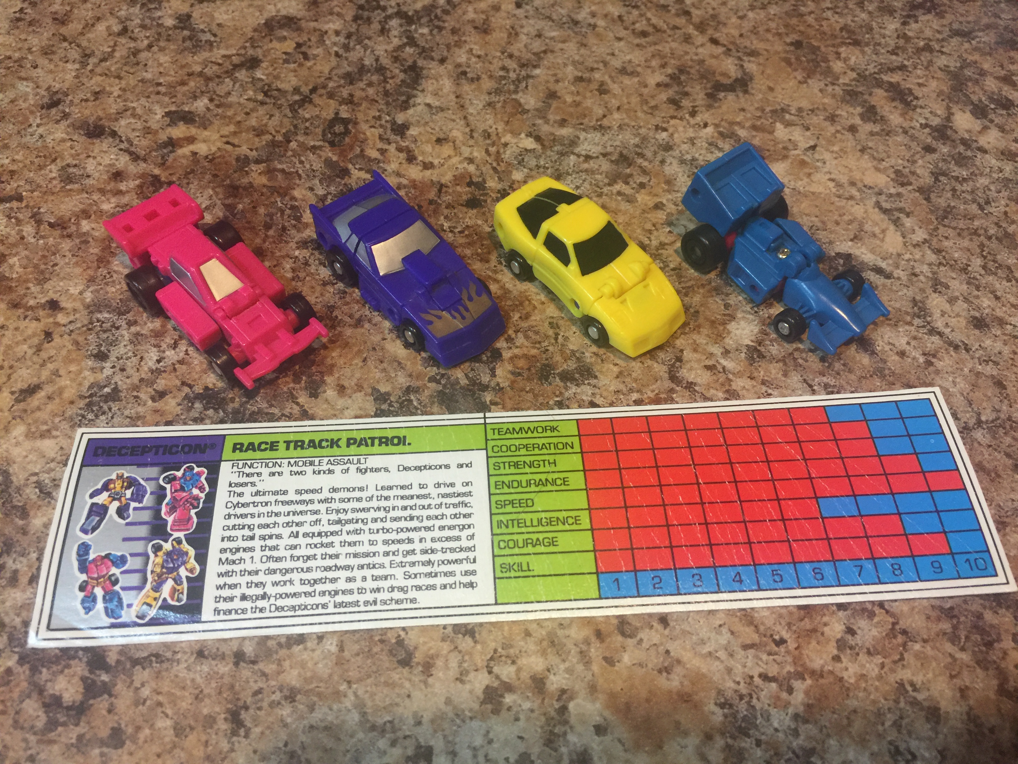 "There are two kinds of fighters, Decepticons and losers."Profile: The ultimate speed demons! Learned to drive on Cybertron freeways with some of the meanest, nastiest drivers in the universe. Enjoy swerving in and out of traffic, cutting each other off, tailgating and sending each other into tail spins. All equipped with turbo-powered energon engines that can rocket them to speeds in excess of Mach 1. Often forget their mission and get side-tracked with their dangerous roadway antics. Extremely powerful when they work together as a team. Sometimes use their illegally-powered engines to win drag races and help finance the Decepticons' latest evil scheme.