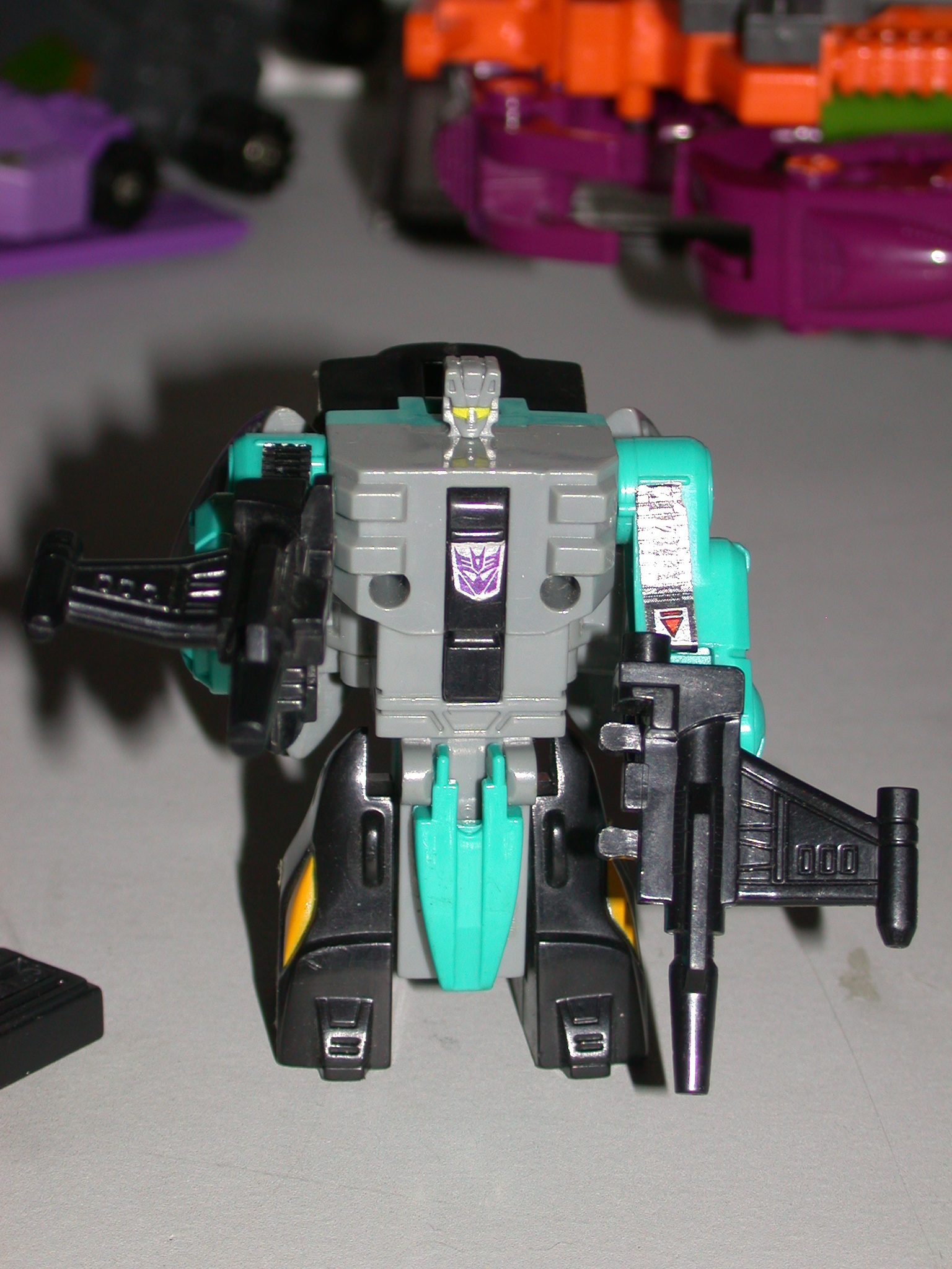 Glides through the seas like a sinister steel spector. Enjoys surprising and then destroying his targets. Nothing escapes his notice... or his grasp. Equipped with electrical, chemical, and infrared sensors, long range sonar. Converts to dual proton blaster in weapons mode. Underwater, can detect and home in on anything living or moving within a 20 mile radius. Maximum speed: 110mph. Armed with double venom lasers that paralyze on contact. Combines with fellow Seacons to form Piranacon. | |||||||