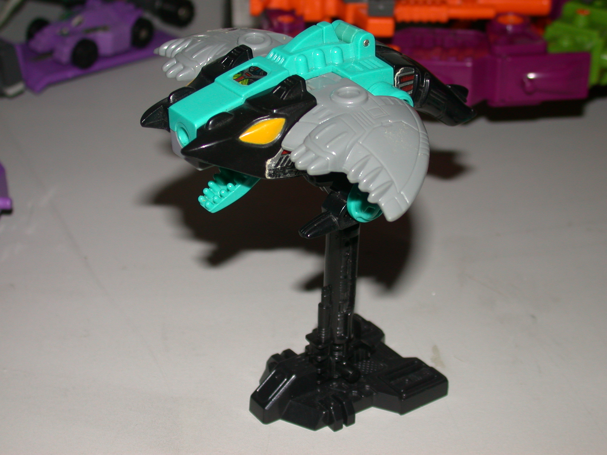 Abilities: In manta ray mode, Seawing employs a battery of sensors - electrical, chemical, infrared - and long-range sonar in his reconnaissance missions. His sensitivity is such that he can locate a screwhead on the ocean bottom up to 20,000 feet below him. He can detect and home in on anything living or moving in the water within a 20-mile radius. His maximum speed is 110 mph. In manta and robot modes, he is equipped with two venom lasers which shoot beams that paralyze on contact. In weapons station mode, he combines with the lasers to become a powerful dual proton blaster. He combines with his fellow Seacons to form the super-robot, Piranacon.