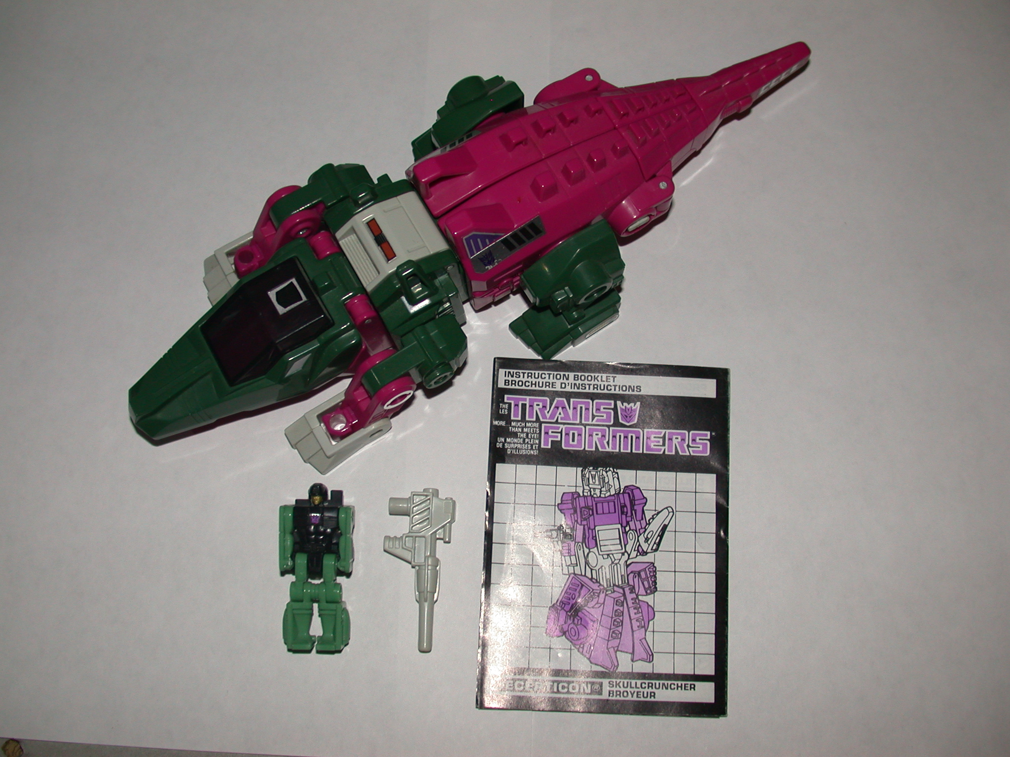 **I managed to get two different Skullcrunchers. The first is near-mint and complete with his tail, Ray Gun, headmaster Grax, Instructions and both an American techspec and what I believe is a Canadian techspec (two languages). The second skullcruncher is in above average condition, with moderate sticker wear. he includes his body and headmaster Grax. I am missing his Tail and gun.**