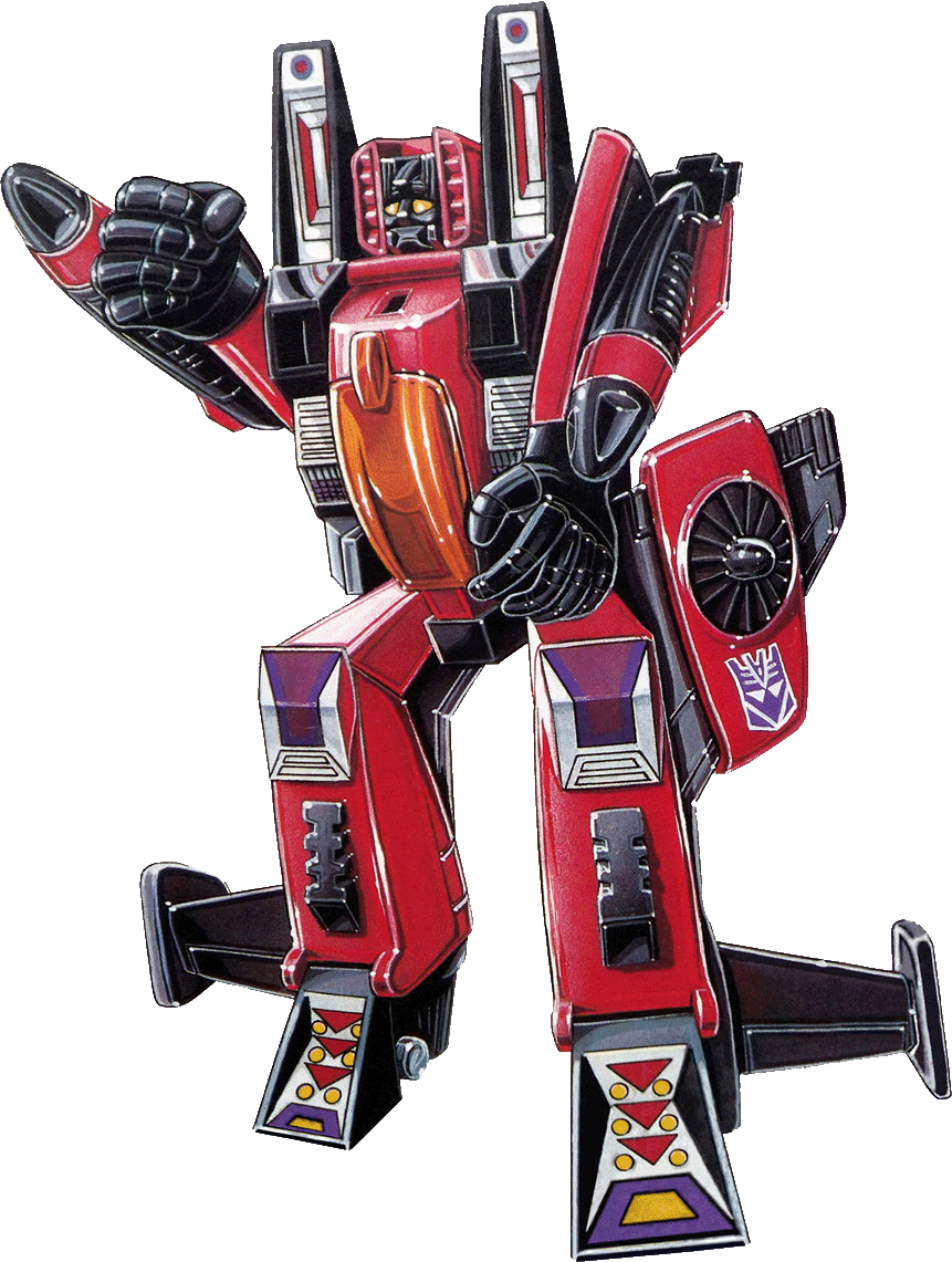 Profile: Rattling the very air with the roar of his jet engines, Thrust is one Decepticon who cares little for the ways of deceit. He believes that half the battle is won if he can "psych out" his enemy by his mere arrival, and so he makes no attempt to be sneaky. His ability to suddenly and powerfully accelerate can literally shake apart a nearby building, and he delights in the havoc that ensues. He is a loud-mouthed braggart who is prone to pompously claim certain victory before a fight has barely begun. But in truth, his courage is as much bluster and noise as his actions and words: a strong counterattack by an opponent usually results in a view of Thrust's tailwings as he recedes into the distance.