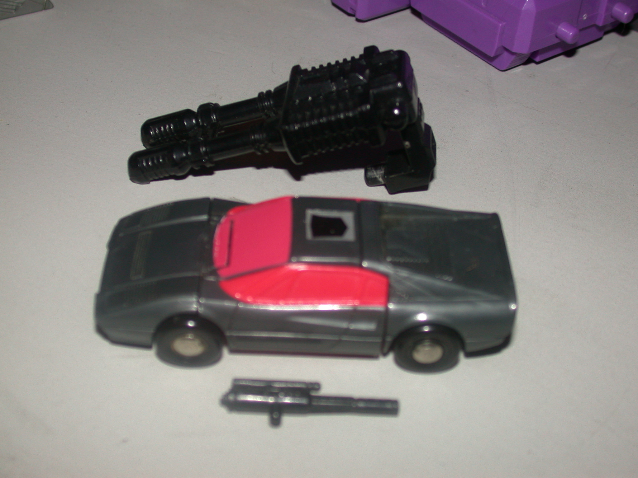 Abilities: Wildrider can reach 250 mph in car mode, and has amazing maneuverability. In robot mode, he uses a scattershot gun, which can spray a fifty-square yard area with searing, ripping laser beams at a distance of ¼ mile. With it, he can demolish a small 5-story building in two minutes. He combines with his fellow Stunticons to form the giant robot "Menasor."