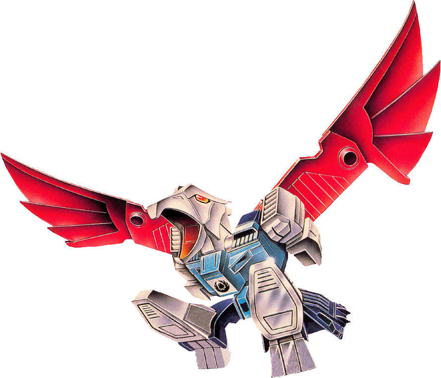 Profile: Always poking his beak where it doesn't belong. Nosey. Voracious appetite for new data to analyze. Looks in people's windows as readily as he spies on enemy troops. In hawk mode, has superb vision. Chemical and infra-red sensors collect and analyze geographical data, locate resources. In robot mode, has two electro-burst rifles. Clone brother is Pounce.