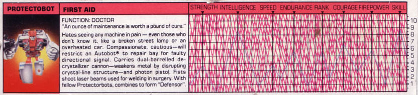 Abilities: In vehicle form, First Aid can travel at 140 mph with a range of 500 miles. He carries a dual-barreled decrystallizer cannon, which disrupts the crystalline structure of most metals, reducing their tensile strength and making them vulnerable to fracture. In robot mode, he carries a photon pistol that shoots light-bursts with the equivalent brightness of 5,000-watt light bulbs, enough to temporarily blind all but those whose optical sensors are the most heavily shielded. Each of his fists can emit a high-temperature, narrow laser beam, which he uses for welding during surgical procedures. He combines with his fellow Protectobots to form the giant robot known as Defensor.