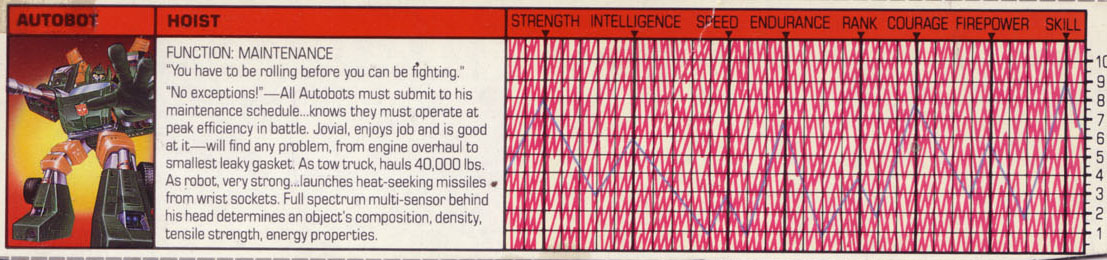Profile: Everybody must submit to his maintenance schedule, even Optimus Prime, and no excuse is ever good enough for Hoist. And he has a good reason for being so strict: even though his job usually keeps him away from the front lines, he knows how important it is that all the Autobot warriors are operating at peak efficiency when they engage in battle. He genuinely enjoys his job, as indicated by the jovial manner in which he performs it. And he's good at his job, too; whether the problem is a full engine overhaul or the smallest leaky gasket, his comrades are confident that Hoist will find it.