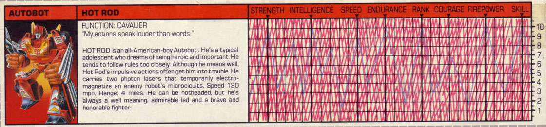 Profile: Hot Rod is the all-American-boy Autobot. Not too sweet, not too sharp, not too snotty... not a goodie-goodie, but basically a typical adolescent who has dreams of doing great stuff and being as heroic and important as Optimus Prime and other famous and revered top Autobots. He tends to follow rules until they bug him - and he sometimes learns, to his regret, that disobeying wasn't exactly smart. And he often acts without thinking in an effort to do the right thing - and this gets him and sometimes his friends in trouble. But he's not afraid when trouble does arrive and is a brave and honorable fighter and friend. He is especially close to Kup, the grizzled old mentor of an Autobot, although he sometimes resents hearing "wisdom." And he likes Daniel, the Earth kid, a lot. (In a way, Hot Rod is big brother to Daniel - a role model - and Hot Rod knows it and takes the responsibility seriously.) In robot or automotive mode, Hot Rod is sometimes hot-headed, but always a well-meaning, admirable "lad" and popular with all who know him.