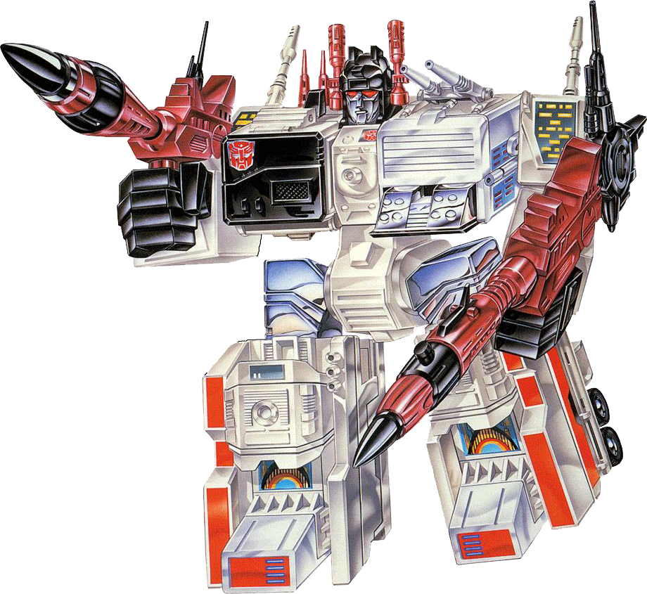 Startlingly versatile, staggeringly strong, the Autobot's last line of defense... a mighty instrument of titanic destructive force. Extremely modest about his achievements... berates himself for not doing more. In robot mode, he can lift 70,000 tons, has shoulder-mounted twin high-energy maser cannons and omni-directional receiving and transmitting antenna. In city mode, has helipad and fully equipped repair bays that can handle four vehicles at once. Left rear tower transforms into tank, Slammer, who has rocket-propelled mortar cannon. Scamper is sports car with side mounted electro-blasters; transforms into robot, uses high-energy particle beam pistol. Six-gun is small robot, has ion-pulse rifles for arms, twin surface-to-air guided missile launchers on back, acetylene pistol. In battle station mode, uses all these weapons and twin disrupter rays, laser lances, powerful anti-matter projectors. | |||||||