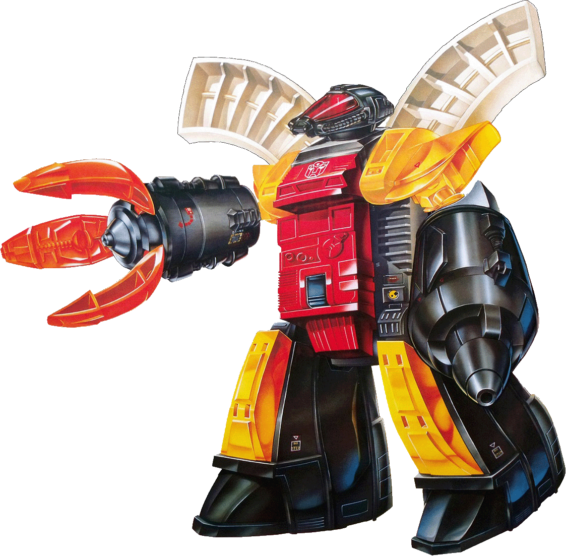The ultimate defense force!  Great strength, even greater courage.  Serious, even grim...last line of Autobot defense.  Protects the Ark and all else vital to his cause.  As robot, can shatter a mountainside, lift 300,000 tons with clawed arm, destroy 12" steel cube with plasma blaster arm.  Has head-mounted laser cannon.  Can transform to laser cannon tank and launching pad with rocket.  Rocket can achieve planetary orbit.