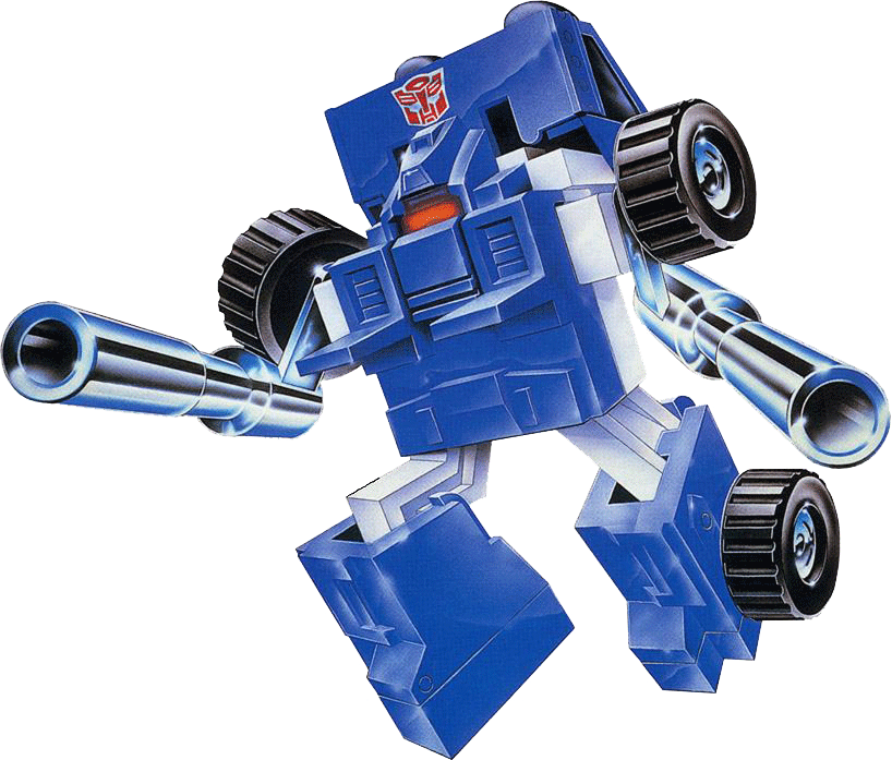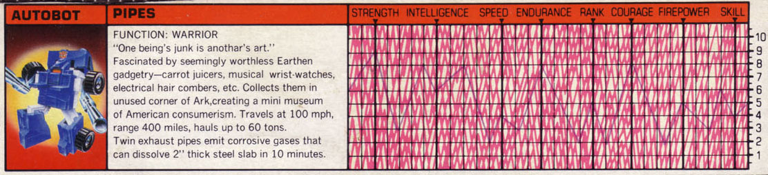 Profile: The more seemingly worthless a gadget, the more Pipes is fascinated by it. And he finds Earth a veritable gold mine of worthless gadgetry: carrot juicers, musical wristwatches, electric hair combers - the capacity of the human imagination never ceases to amaze Pipes! He is so enthralled by all this that he now collects these artifacts, creating a sort of mini-museum of American consumerism in an unused corner of the Ark. Pipes doesn't allow his hobby to interfere with his responsibilities to the Autobot struggle - at least not usually. Even while on a mission, he's been known to pull over to the curb and enviously ogle a human walking by using a hand-held, portable electric fan. Pipes explains, "The true collector never knows when or where he'll discover his next treasure."