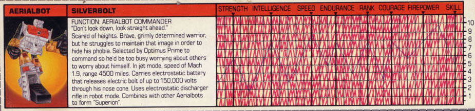 Weaknesses: As long as Silverbolt is busy leading or fighting, he's fine, but when he's simply flying, particularly by himself, his fear of heights begins to manifest itself. The effect can be devastating; he might start flying wildly, go into a tailspin or even crash.
