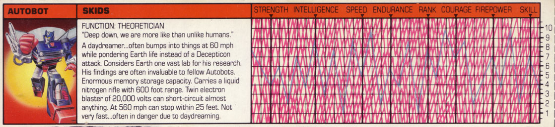 Abilities: Skids has an enormous memory storage capacity. He can record visual information virtually instantaneously, and has been known to scan an entire college library's collection in two hours. In Autobot mode, he carries a liquid nitrogen rifle, which shoots a stream of the super-cooled element up to 600 feet. He also uses an electron blaster, which emits a burst of 20,000 volts and can short-circuit virtually any mechanical foe. In car mode, his brakes, by far the best among the Autobots and courtesy of Wheeljack's genius, can decelerate him from 60 mph to zero within 25 feet. Of course, such sudden stops aren't too good for the well-being of any car, including Skids.