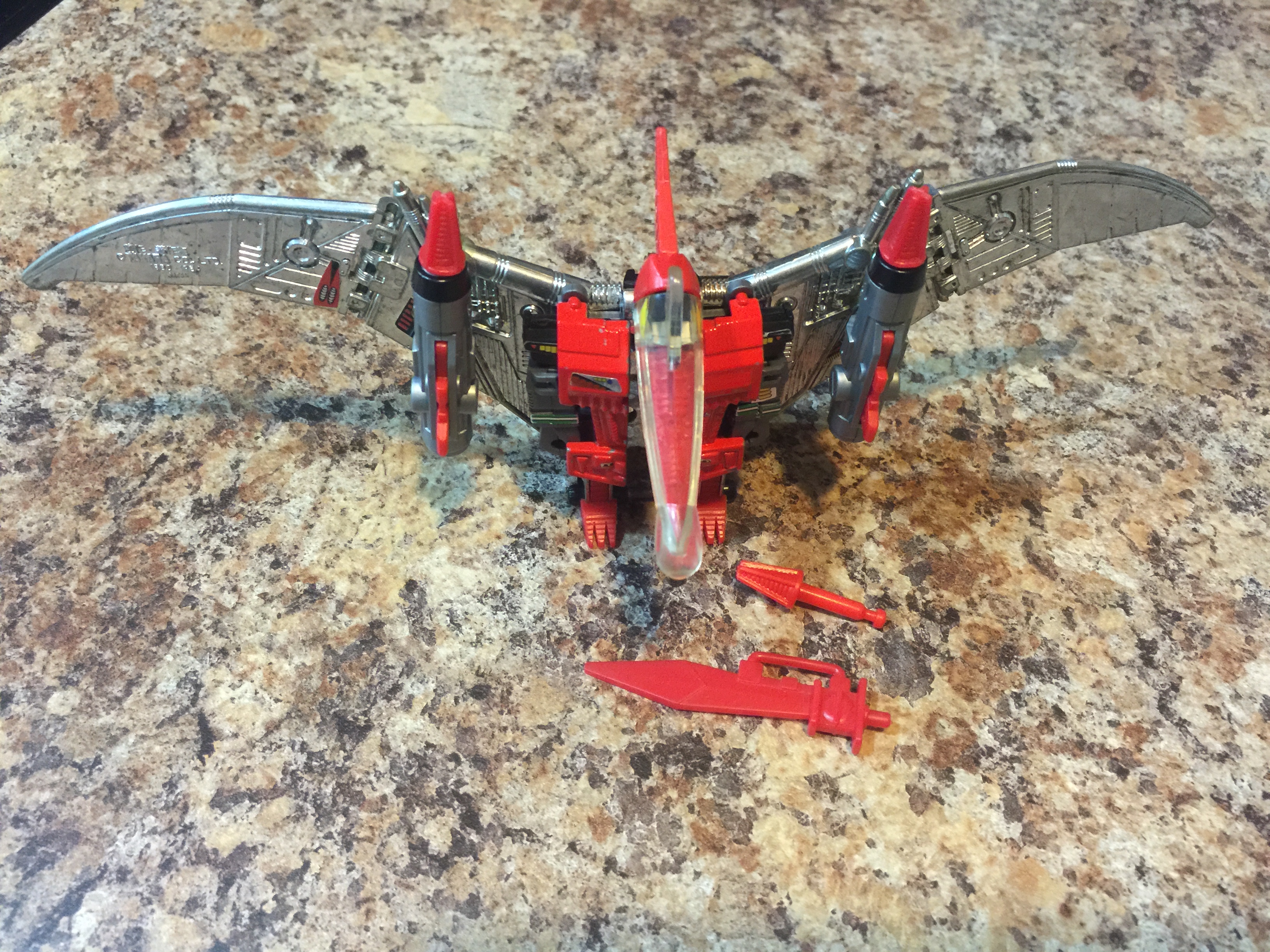 **I got Swoop in October 2015 on a good deal from a local seller I met on eBay.  The Dinobots have been late to my collection mostly due to their popularity, therefore expensive cost of purchase.  I just have decided to keep my eyes open for that rare deal, and this purchase of Swoop is one such deal.  He is complete as of time of purchase and came with his Electron cannon and rocket pod.  He is in very great cosmetic condition though he does have loose pieces.