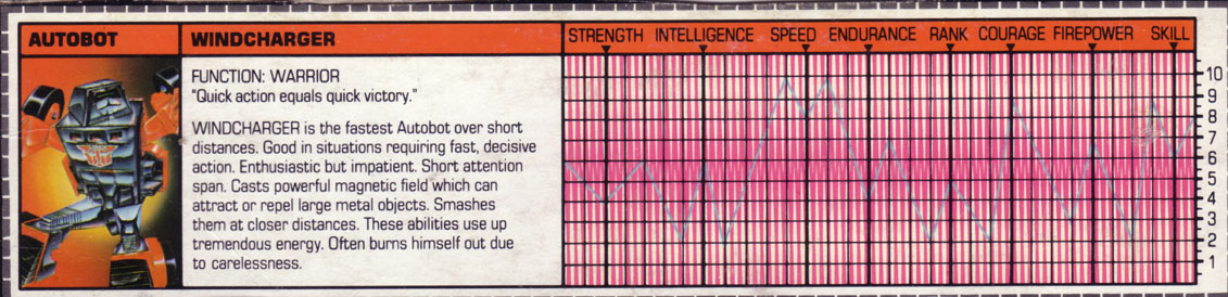 Windcharger is the fastest Autobot over short distances. Good in situations requiring fast, decisive action. Enthusiastic but impatient. Short attention span. Casts powerful magnetic field which can attract or repel large metal objects. Smashes them at closer distances. These abilities use up tremendous energy. Often burns himself out due to carelessness.