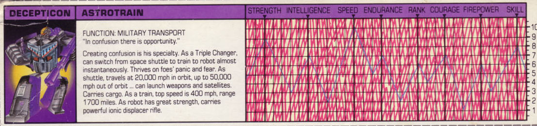 Profile: Creating confusion is Astrotrain's specialty. As a Decepticon Triple Changer he can switch from robot to locomotive train to space shuttle almost instantaneously. This ability not only leaves unsuspecting enemies perplexed, but often vulnerable to his attack. His favorite ploy is to lure an Autobot to chase him as he enters a railroad tunnel in train mode and then exits in shuttle mode. The Autobot is usually ill-prepared to battle the shuttle-mode Astrotrain and rarely knows whether two Decepticons or one confront him. But it is that particular moment when his opponent realizes his mistake that especially delights Astrotrain. He truly lives for that moment and thrives on his foe's panic and fear. "It makes it all worthwhile," Astrotrain says gleefully. "That part I enjoy even better than destroying him afterwards!"