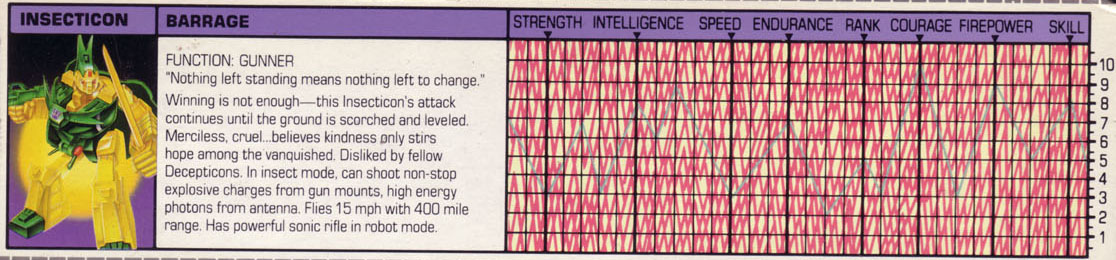 400 mile range. Has powerful sonic rifle in robot mode. Winning is not enough -- this Insecticon's attack continues until