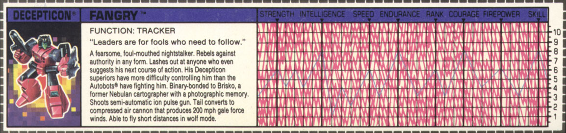 A fearsome, foul-mouthed nightstalker. Rebels against authority in any form. Lashes out at anyone who even suggests his next course of action. His Decepticon superiors have more difficulty controlling him than the Autobots have fighting him. Binary-bonded to Brisko, a former Nebulan cartographer with a photographic memory. Shoots semi-automatic ion pulse gun. Tail converts to compressed air cannon that produces 200 mph gale force winds. Able to fly short distances in wolf mode. | |||||||