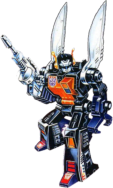 Charming, but cruelly clever... makes friends so he can influence them to do his bidding by digging up facts he can hold against them. Humans particularly susceptible to this Insecticon. In insect mode can jump 40 ft. for a distance of .1 miles... kick a hole in 1/4 inch steel. In robot mode can fly 30mph up to 100 miles. Sub-machine gun fires 300 rounds per minute. Very vulnerable as insect and flying in high winds.