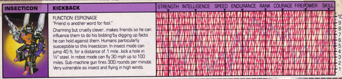 Abilities: In his insect mode, Kickback can use his powerful leg modules to propel him up to heights of 40 feet and over distances of a tenth of a mile. Although small in this form, a single kick of his can punch a hole in a ¼" steel plate. In robot form he can use his wings to fly at speeds up to 30 mph for distances up to 100 miles. He carries a sub-machine gun that can shoot up to 300 rounds per minute of armor-piercing titanium-coated bullets.