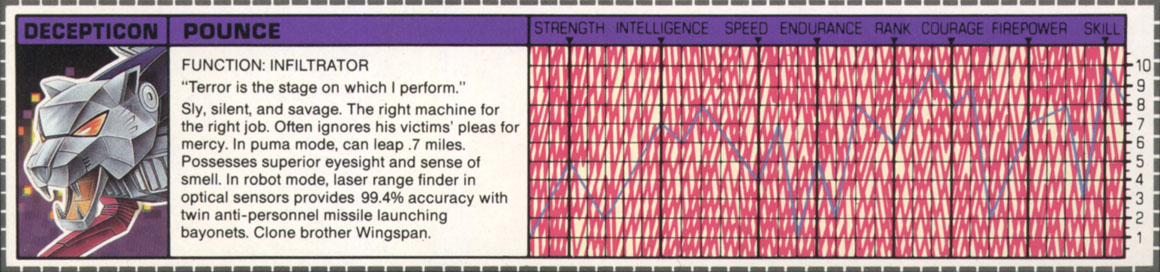 Sly, silent, and savage. The right machine for the right job. Often ignores his victims' pleas for mercy. In puma mode, can leap .7 miles. Possesses superior eyesight and sense of smell. In robot mode, laser range finder in optical sensors provides 99.4% accuracy with twin anti-personnel missile launching bayonets. Clone brother is Wingspan. | |||||||