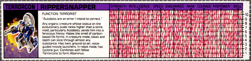 Profile: Any organic creature whose status on the evolutionary scale ranks higher than a slime mold, particularly Autobots, sends him into a ferocoius frenzy. Hates the smell of carbon-based life forms. In creature mode, claws and teeth can slice through almost any substance. Has twin, ground-to-air, voice-guided missile launchers. In robot mode, has cyclone gun. Combines with fellow Terrorcons to form Abominus.