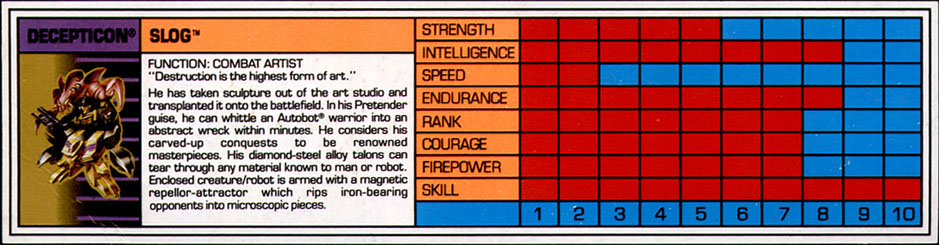 He has taken sculpture out of the art studio and transplanted it onto the battlefield. In his Pretender guise, he can whittle an Autobot warrior into an abstract wreck within minutes. He considers his carved-up conquests to be renowned masterpieces. His diamond-steel alloy talons can tear through any material known to man or robot. Enclosed creature/robot is armed with a magnetic repellor-attractor which rips iron-bearing opponents into microscopic pieces. | |||||||
