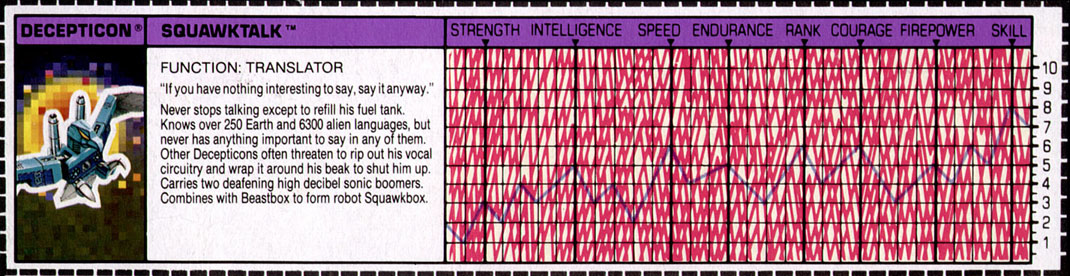 Profile: Never stops talking except to refill his fuel tank. Knows over 250 Earth and 6300 alien languages, but never has anything important to say in any of them. Other Decepticons often threaten to rip out his vocal circuitry and wrap it around his beak to shut him up. Carries two deafening high decibel sonic boomers. Combines with Beastbox to form robot Squawkbox.